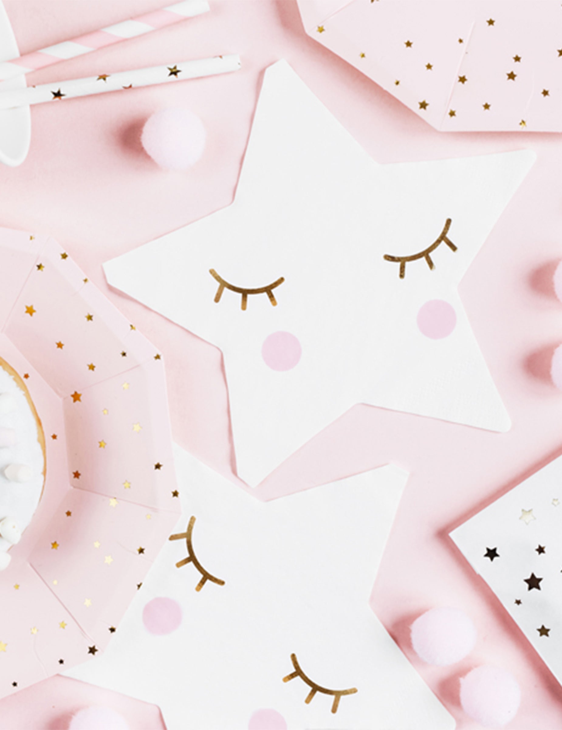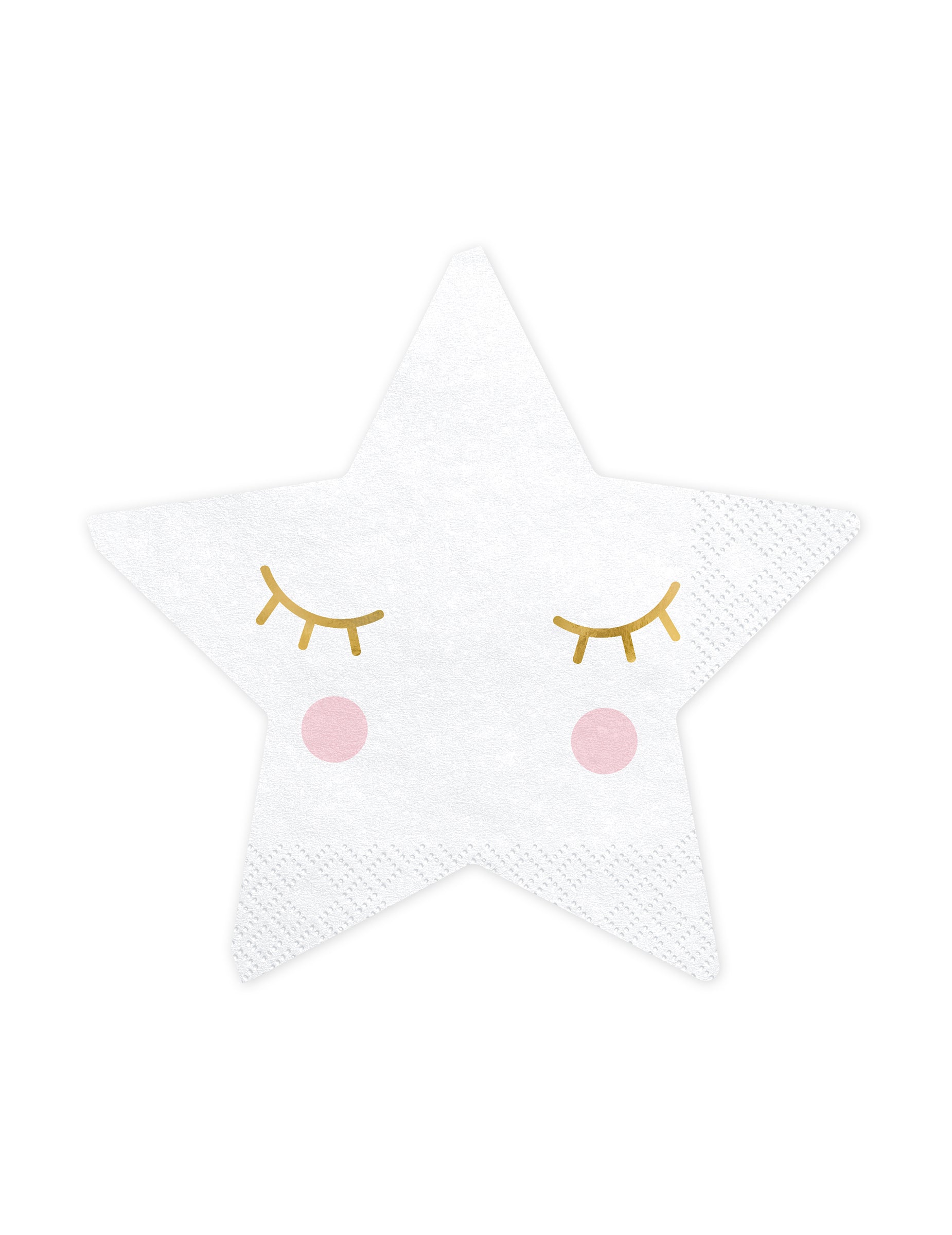 Ce lot de 20 serviettes en papier jetables se présente sous la forme d'une mignonne étoile blanche. agrémentées de jolis yeux dorés et de petites joues roses, elles mesurent 16 x 16 cm. ces serviettes étoiles créeront une ambiance poétique pour fêter un anniversaire ou une baby shower.