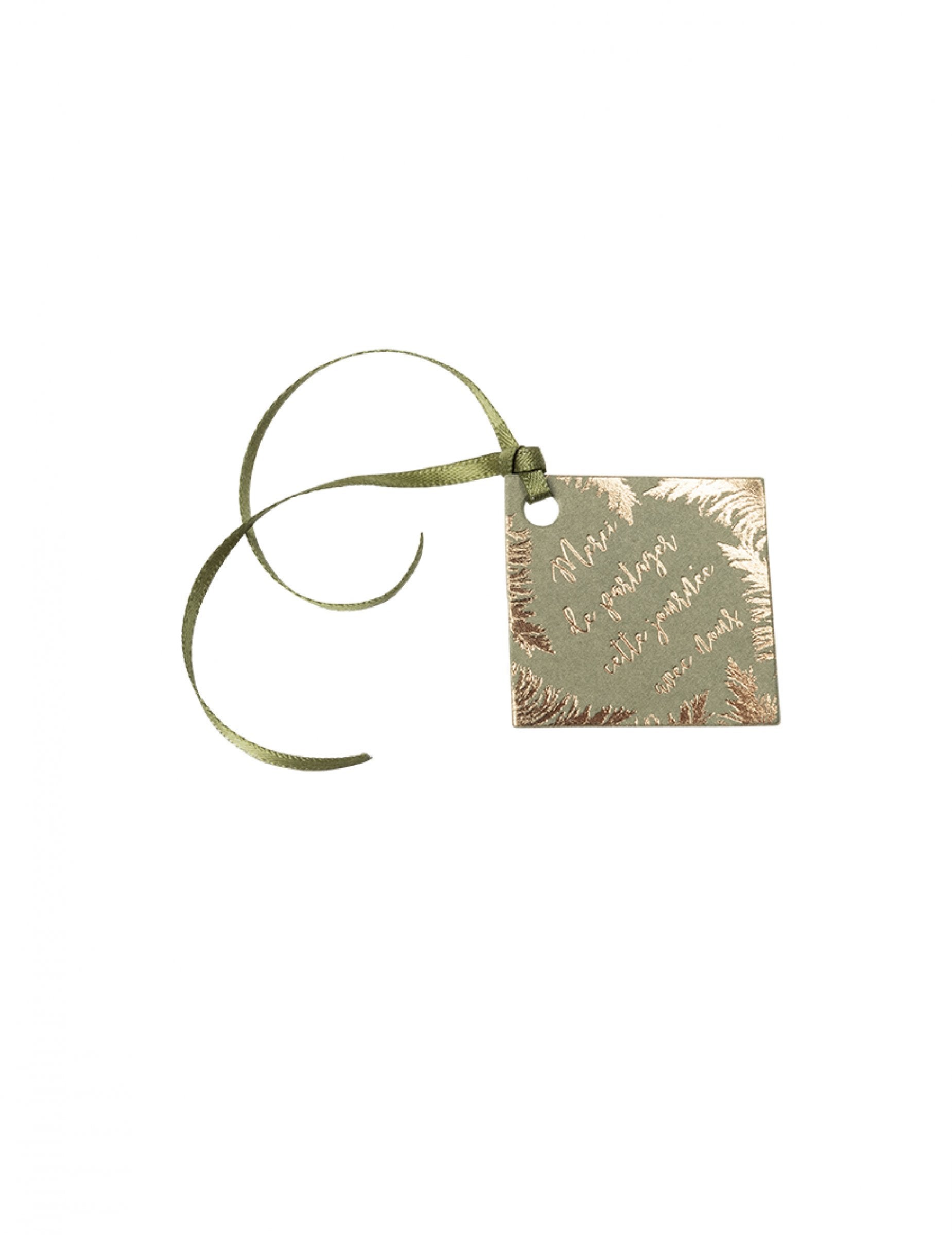Добавете нотка елегантност към вашия декор с този комплект от 10 броя етикети в картон 4 x 4 cm. Тези аксесоари са в изискан каки цвят, украсени със златни мотиви от пампас трева и посланието на благодарност „Благодаря ви, че споделихте този ден с нас“. Всяка част се предлага с деликатна сатенена панделка, идеална за лесно закрепване към вашите чаши или кутии за подаръци. Тези изискани канцеларски материали са идеални за изразяване на вашата благодарност към вашите гости. брак или бохемска церемония.