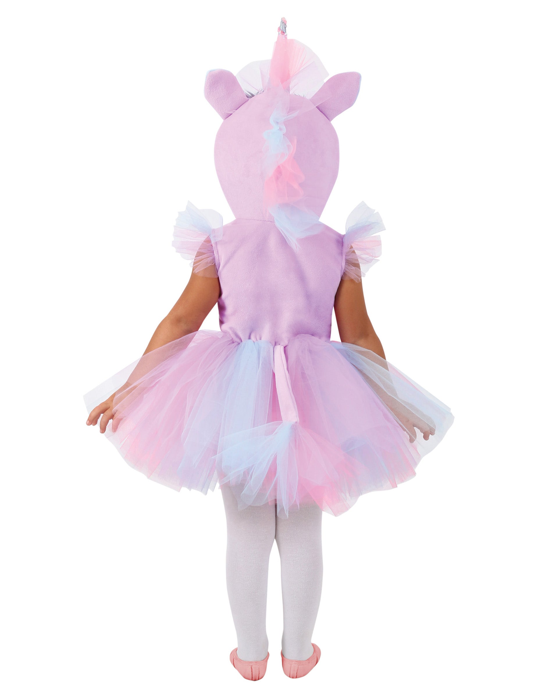 Този костюм за бебешко еднорог се състои от рокля с качулка (чорапогащи и обувки не са включени). Роклята без ръкави е бледо лилаво, със светлосиньото коремче. Тя има качулка, която да представи главата на еднорога. На него са фиксирани уши, грива и рог. Дъното на роклята е направено от цветни платна, за да му придаде ефект на туту. Този пастел костюм ще бъде перфектен за омагьосване на всички малки момичета!