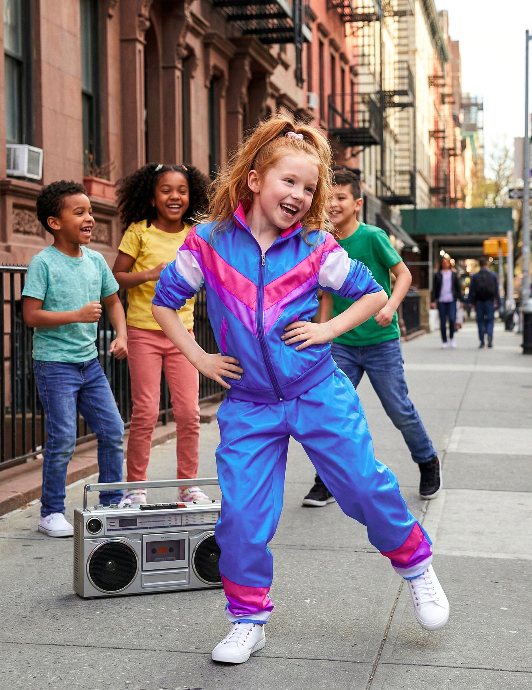 Тази маскировка за джогинг от 80 -те е за момичета. Има яке и панталони. Горната част е синьо яке с ивици от розова, лилава и бяла тъкан в типичен стил от 80 -те. Дъното е анталон от еластично -wais в син еластичен размер също с ленти от розова, лилава и бяла тъкан на глезените. Този спортен анцуг от 80 -те ще бъде идеален за вечер, прикрит на темата на 80 -те или за карнавала.