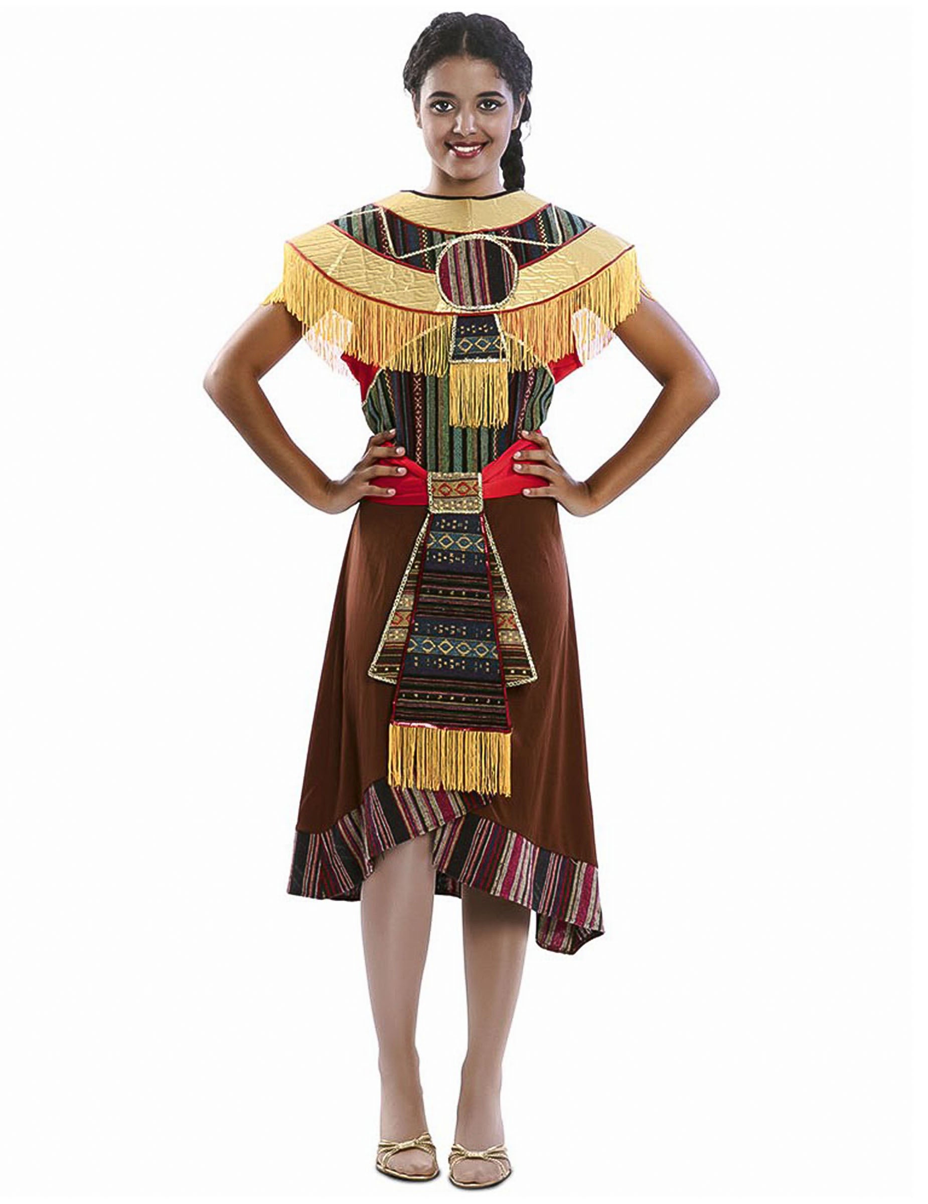 Този ацтекски костюм за жена включва рокля, яка и колан. Роклята е без ръкави, кафява, с цветни райета от етнически стил.