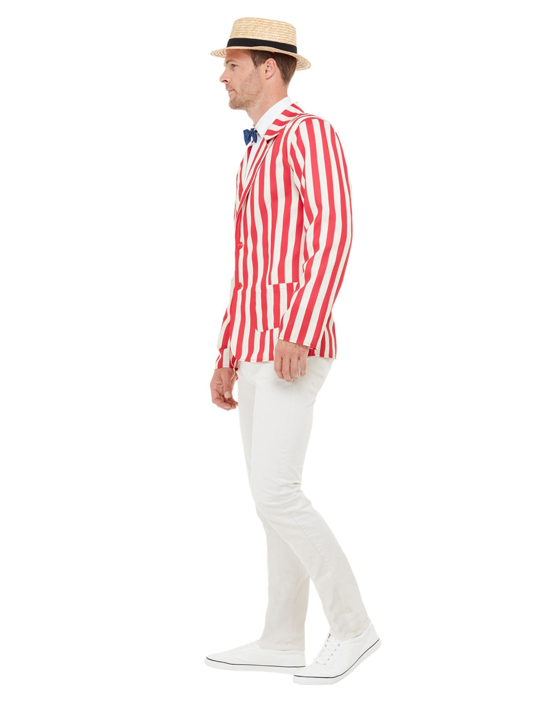 Този бръснар костюм от 20 -те за мъже се състои от яке, шапка и папийонка (риза, панталони и обувки не са включени). Якето е с червени и бели ивици. Тя има джобове отстрани и се затваря с червени пъпки отпред. Шапката е в прозрачна слама, с тъмносиня лента за глава в основата си. И накрая, малко син възел на пеперуда завършва този костюм. Тази маскировка ще бъде идеална, за да ви постави на мода от 20 -те за Карнавала.