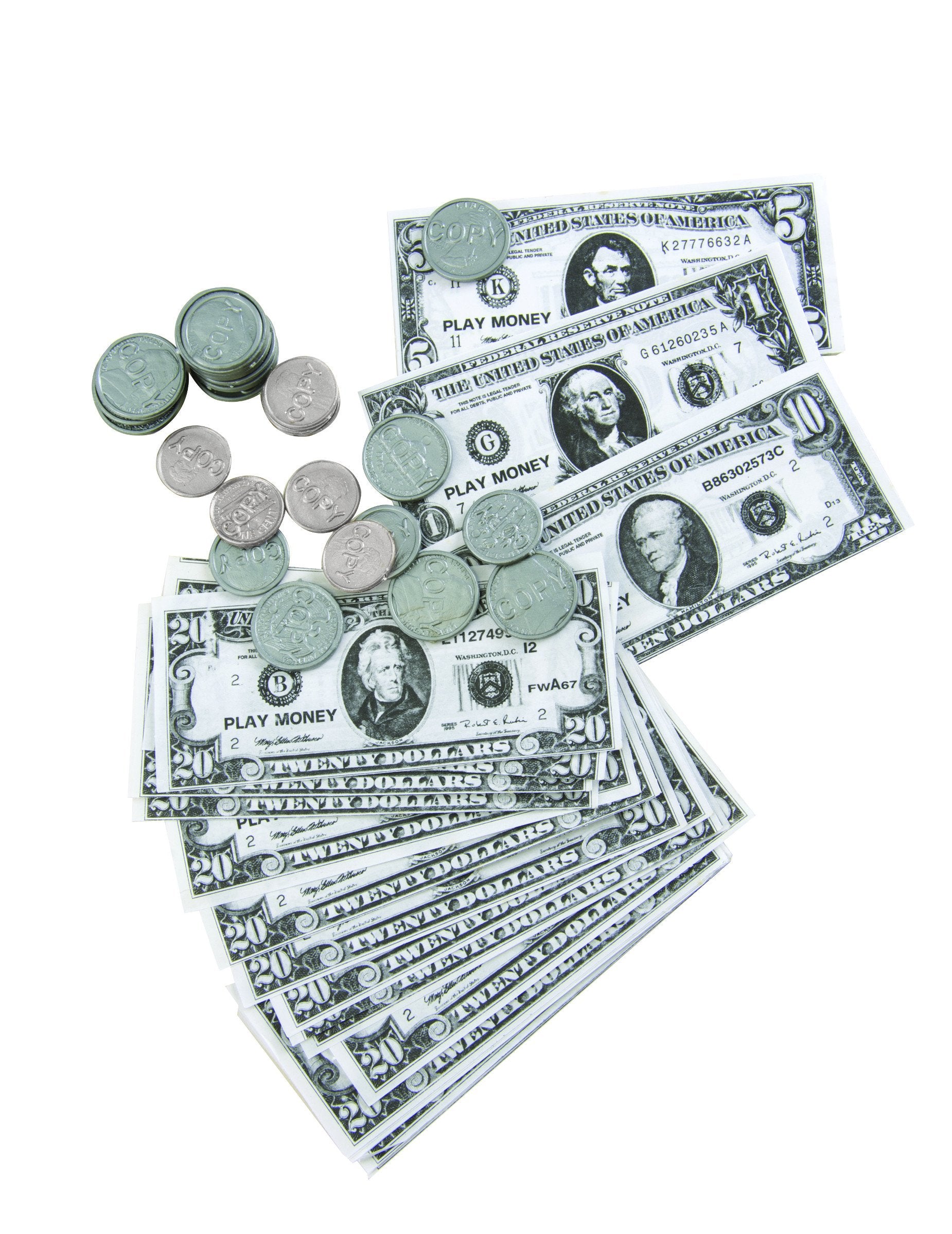 Този комплект е съставен от фалшиви билети и долари. 16 -те малки монети са изработени от пластмаса. Хартиените билети измерват приблизително 10,5 х 5 cm. Те са отпечатани от едната страна, за да дадат илюзията за фалшиви долари. Те се разпространяват по следния начин: - 10 билета за 100 долара - 10 билета за $ 20 - 10 билета за 10 долара - 10 билета за $ 5 - 10 билета за $ 1 Този комплект ще бъде перфектен за завършване на вашата декорация от време на време на казино вечер.