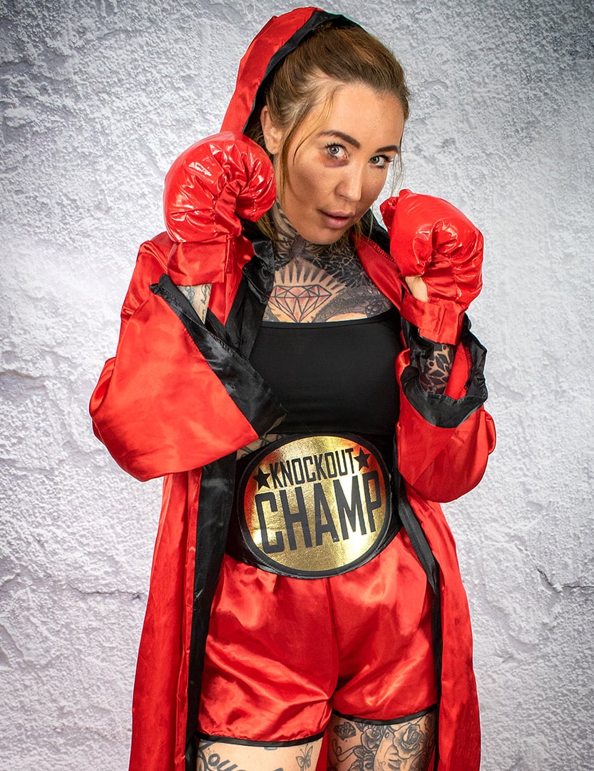 Този луксозен боксерски костюм за жени се състои от топ, къси панталони, колан, чифт ръкавици и халат. Горната част е къс резервоар с черен цвят. Кратките къси панталони са изработени от червена сатенена тъкан с черна граница на дъното. Доста сатен червен халат, ограден с черно с голяма качулка, завършва тоалета за още повече чар и реализъм. Присъства широк колан от черно -златен шампион по бокс. Ръкавиците са лакирани и червени, те перфектно допълват този висококачествен костюм. С този луксозен боксьор костюм олицетворява пръстен на ринга по време на вечер по темата за спорта или униформите.