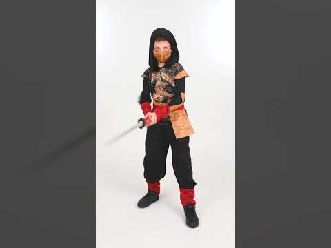 Тази традиционна детски маскировка нинджа се състои от високи, панталони, колан и маска (обувките и сабя не са включени). Горната част е черна и червена и съставена от бежови панели на ръцете и талията. Отпред е декориран с великолепен дракон. Червеният колан ще бъде огънат туниката. Панталоните са със същия цвят като върха. Той е широк в течна тъкан и е перфектно свързан с туниката. Бежовата маска припомня високите панели и завършва маскирането. Покрива носа и устата. Този костюм на нинджа ще бъде идеален за вашето дете по време на карнавал или по повод прикритите ви вечери!