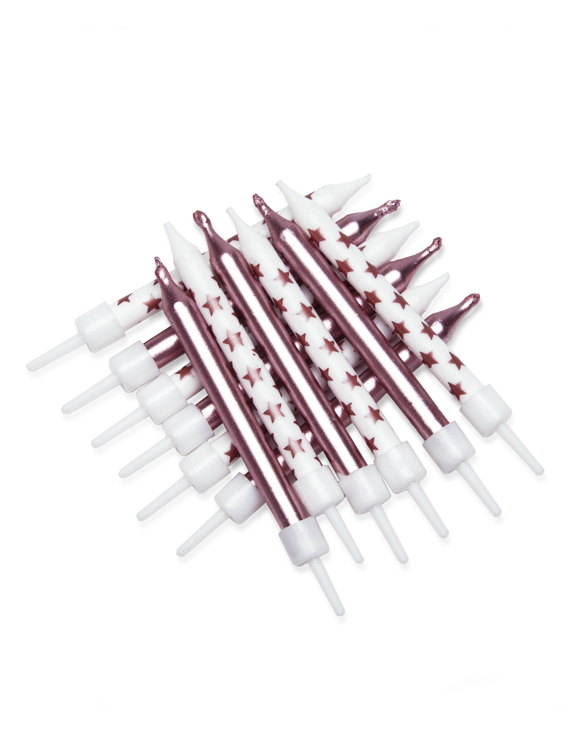 Добавете нотка елегантност с този комплект от 12 броя свещи от 7,5 cm. Пакетът съдържа свещи Розово златисти едноцветни, както и бели модели, поръсени с блестящи звезди. Това е идеалният аксесоар за озаряване на вашата торта.рожден ден посветен на тема от розово злато !