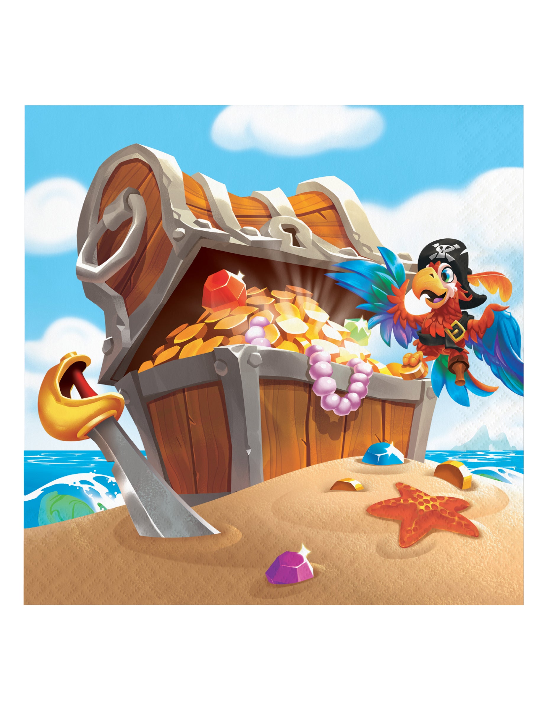Добавете нотка приключение към вашето парти с този комплект 16 салфетки еднократна употреба с размери 33 x 33 cm веднъж разгънат. Дизайнът илюстрира великолепно пиратско съкровище охраняван от пиратски папагал на тропически остров. Вижда се и там пиратски меч и блестящи бижута. Тези кърпи цветните са идеални за допълване на вашия украса за маса за рожден ден запомнящо се на пиратска тема.