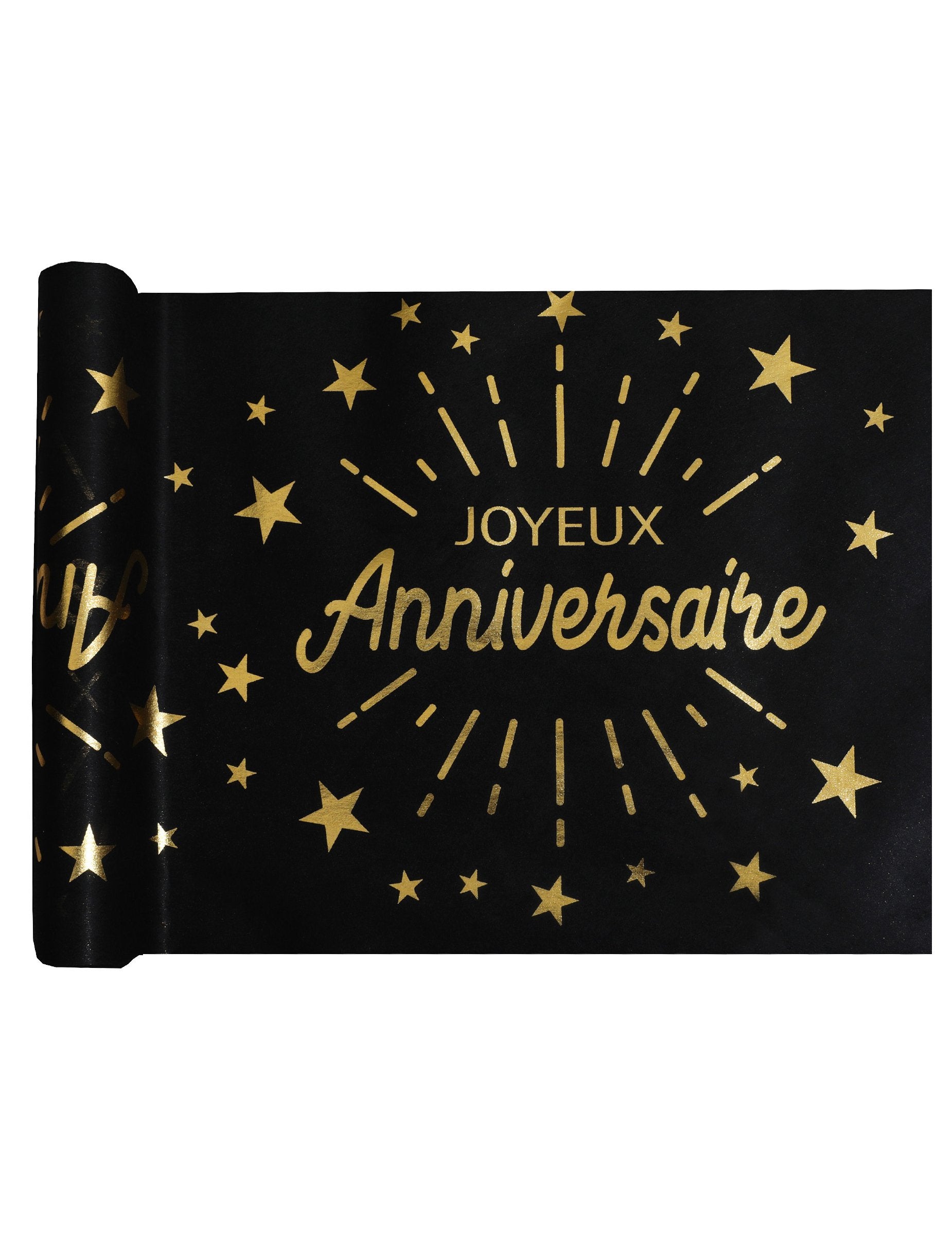 Sublimez votre décoration de fête avec ce chemin de table intissé de 5 m de longueur sur 30 cm de largeur. Ce modèle élégant aux teintes noires et dorées est orné de l'inscription « Joyeux Anniversaire », ce qui le rend parfait pour une ambiance raffinée. Ce chemin de table est l'accessoire idéal pour parfaire votre décoration d'anniversaire avec une note de prestige.