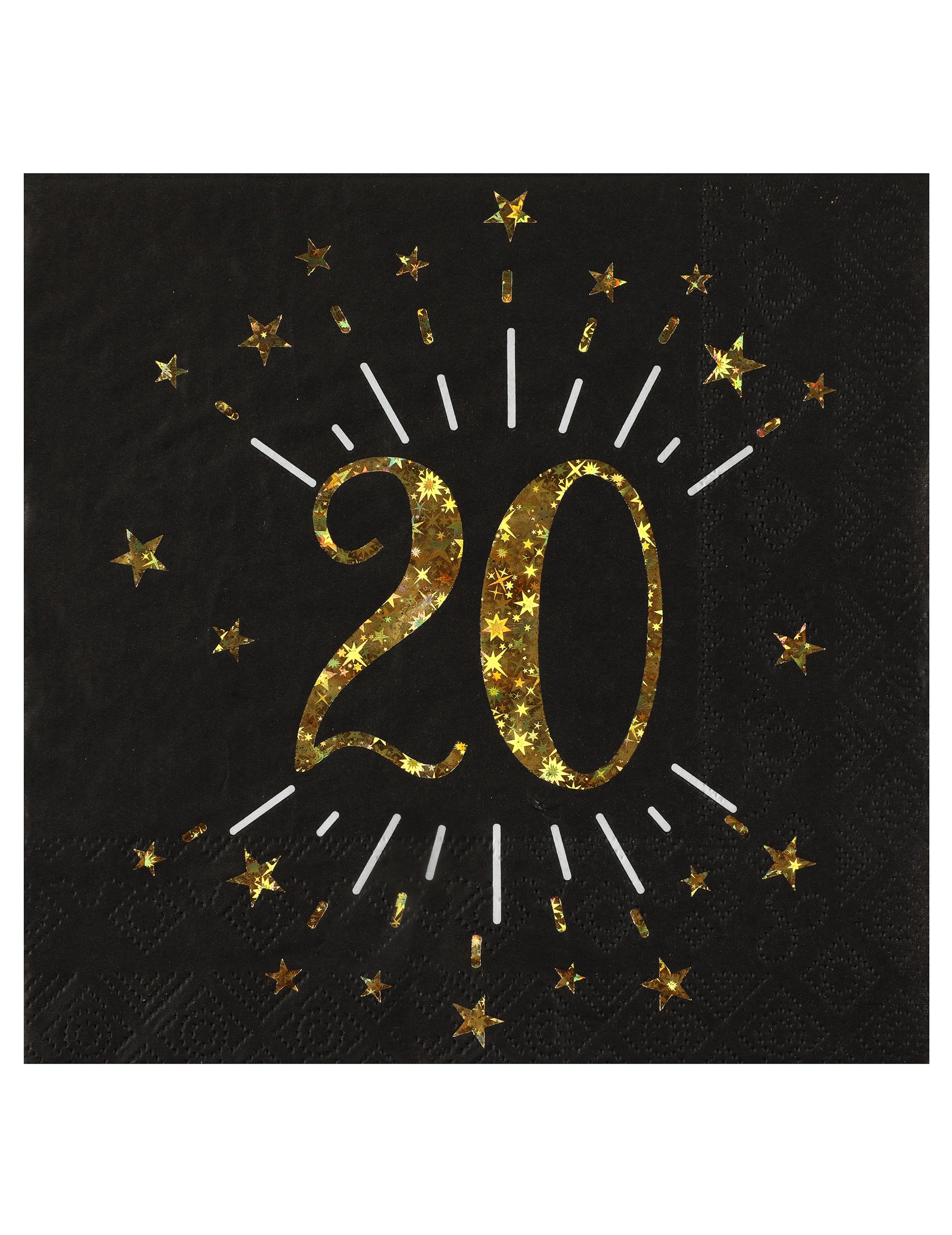 Ce lot de 10 serviettes spécial anniversaire 20 ans affiche des dimensions de 33 cm x 33 cm. Chaque exemplaire présente un fond noir sobre orné du chiffre 20 en impression dorée. Des petites étoiles entourent le motif pour illuminer votre buffet de fête.