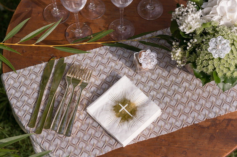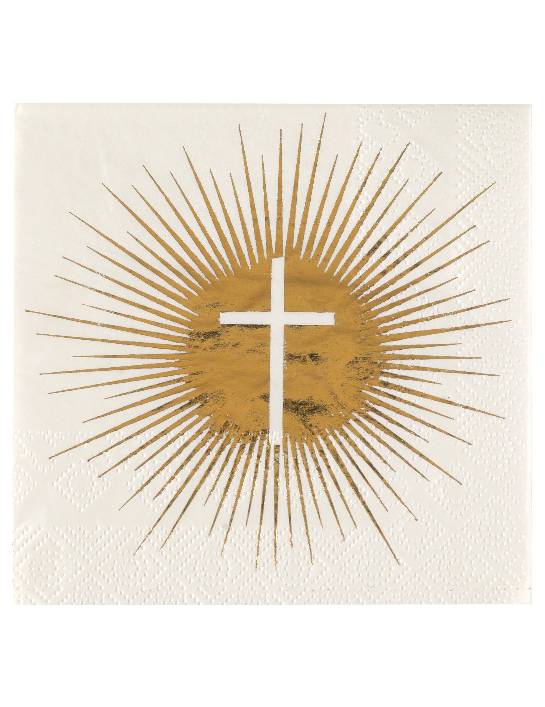 Ce lot comprend 20 serviettes jetables conçues pour une cérémonie. D'un format de 12,5 x 12,5 cm, ces modèles blancs affichent un élégant halo doré brillant agrémenté d'une croix centrale. Elles sont parfaites pour décorer votre table lors d'une cérémonie religieuse telle qu'un baptême, une communion ou une célébration de mariage.