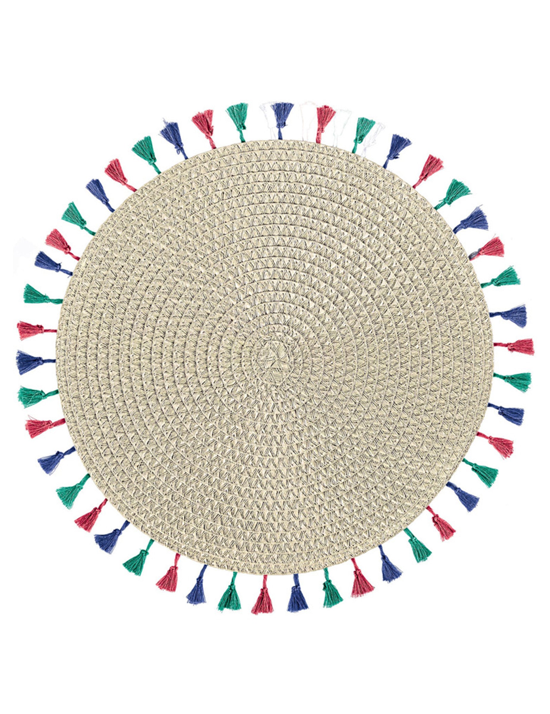 Добавете нотка оригиналност към вашето посрещане с това подложка за хранене кръг от 38 cm. Проектиран в естествен светло бежов нюанс, този аксесоар демонстрира стил бохемски вибрации Уникален благодарение на цветните си помпони в синьо, червено и зелено. подложка за хранене е идеалният елемент за подобряване на декорацията на масата рожден ден бохем или брак селски.