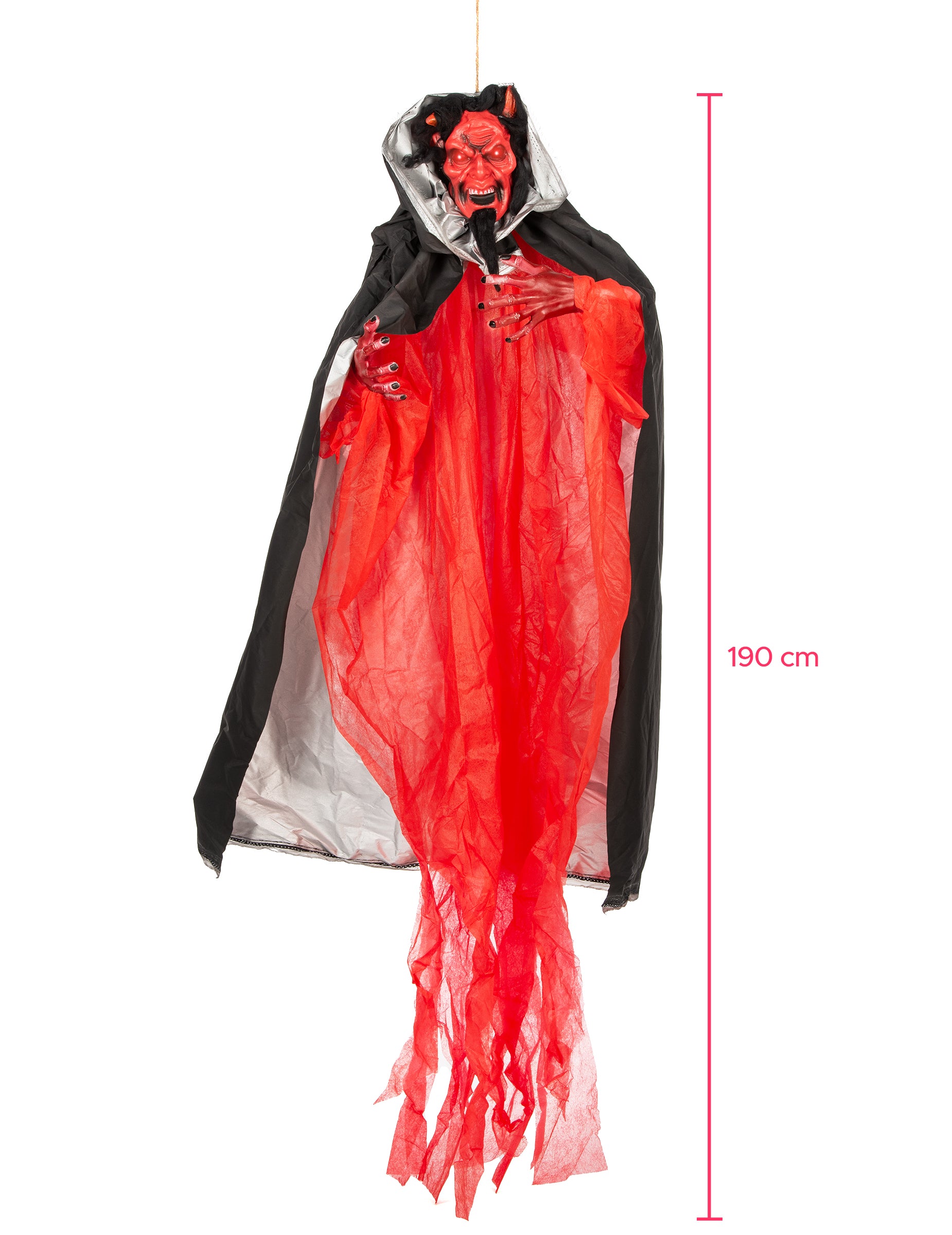 Тази анимирана и ярка декорация представлява демон. Всичко е облечено в червено и има глава на демон с рога и черен барбикет. Тази декорация е с дължина приблизително 190 см. Очите са ярки и ще станат червени чрез осветление. Работи с 3 LR44 батерии. Той ще бъде идеален за декориране на къщата ви в Хелоуин вечер.