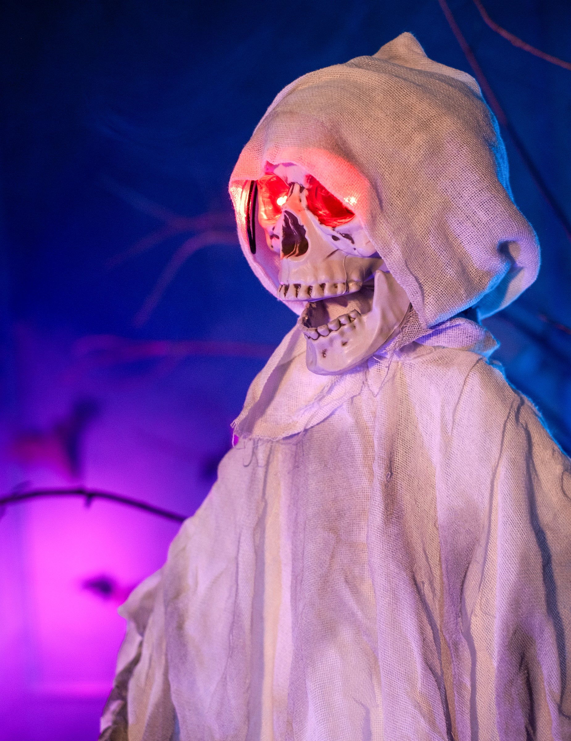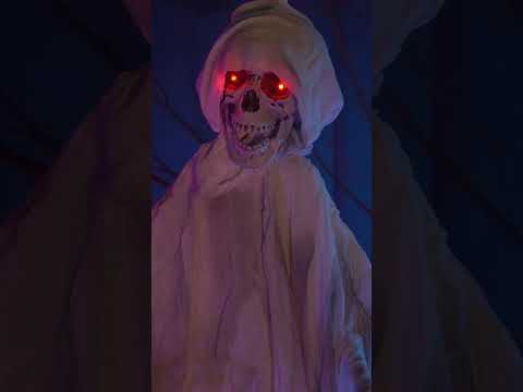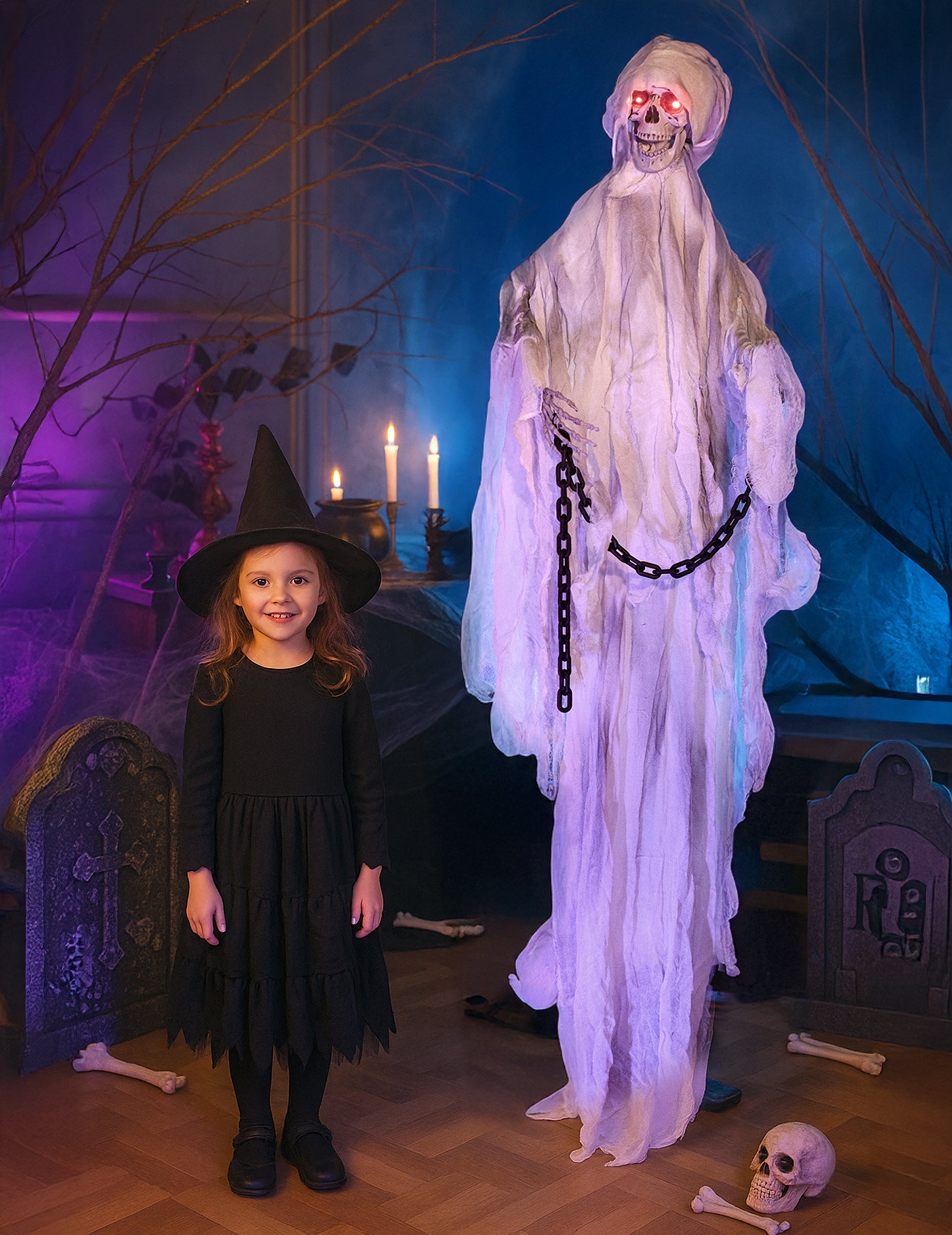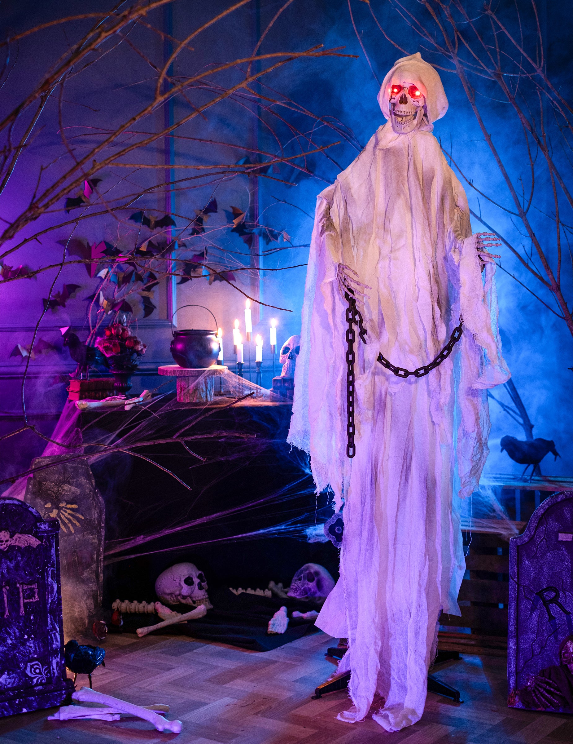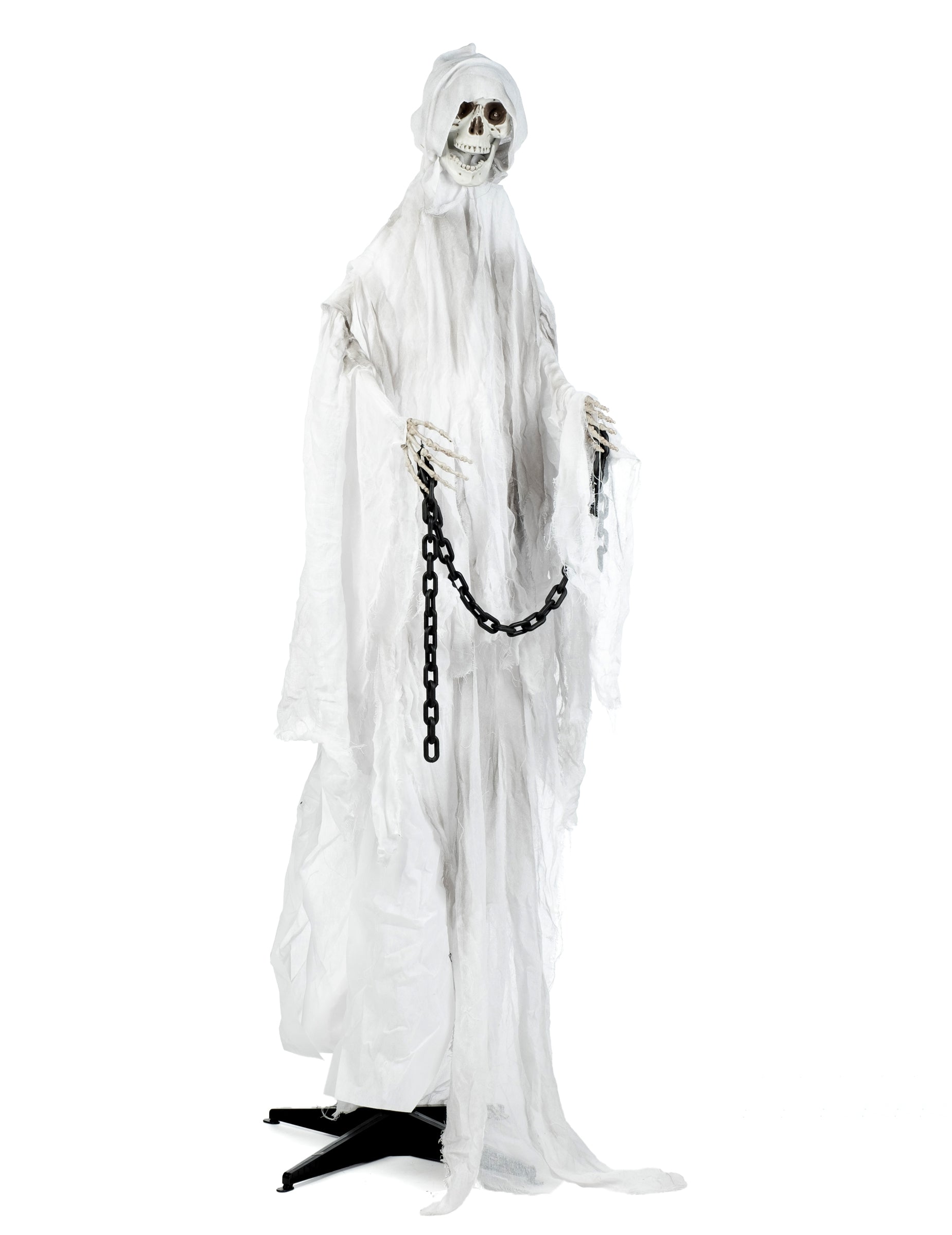 Тази призрачна декорация, окована на крака, е с размери приблизително 190 cm. Скелетът е покрит с нос и износена качулка. Скелетът има устата широко отворена. Кожата му е бяла точно като носа и качулката. Очите му образуват две черни дупки, които разкриват малка червена точка и носът му е изкопан. Той държи черен канал между фините си скелетни пръсти. Изберете тази фентъзи декорация, окована през следващата си вечер за Хелоуин, за да плашите гостите си!