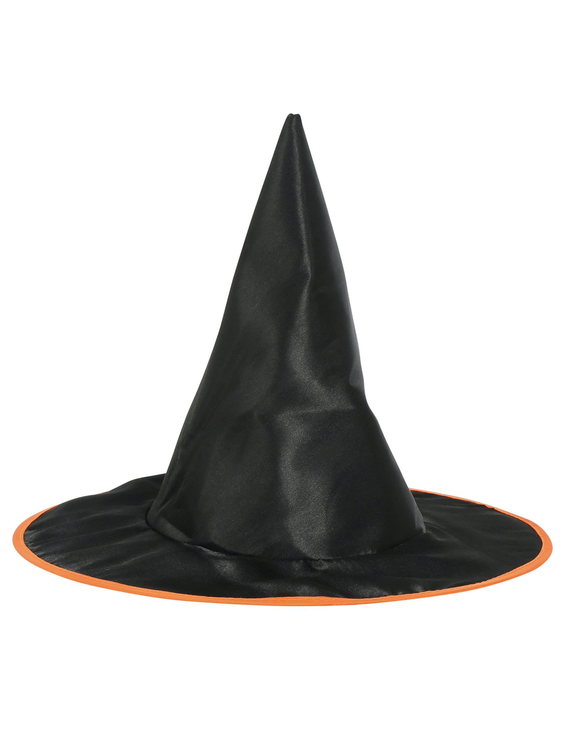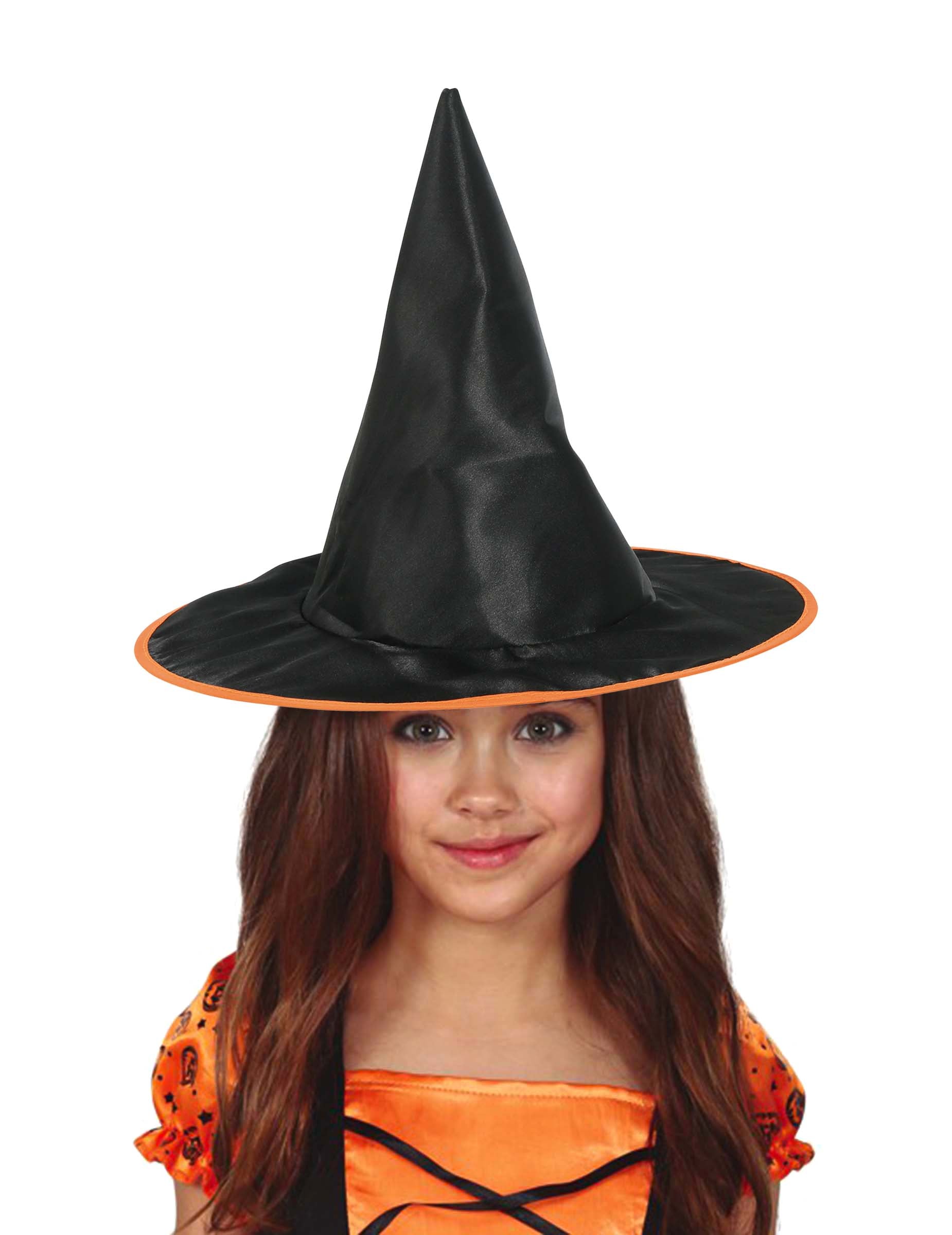 Тази шапка на вещици е за деца. Напълно черен, той е декориран с оранжева граница по целия си ръб. Лесно се поддържа на главата на детето. Доста черна и оранжева шапка за вещици за най -безстрашните подготвители на отвари!