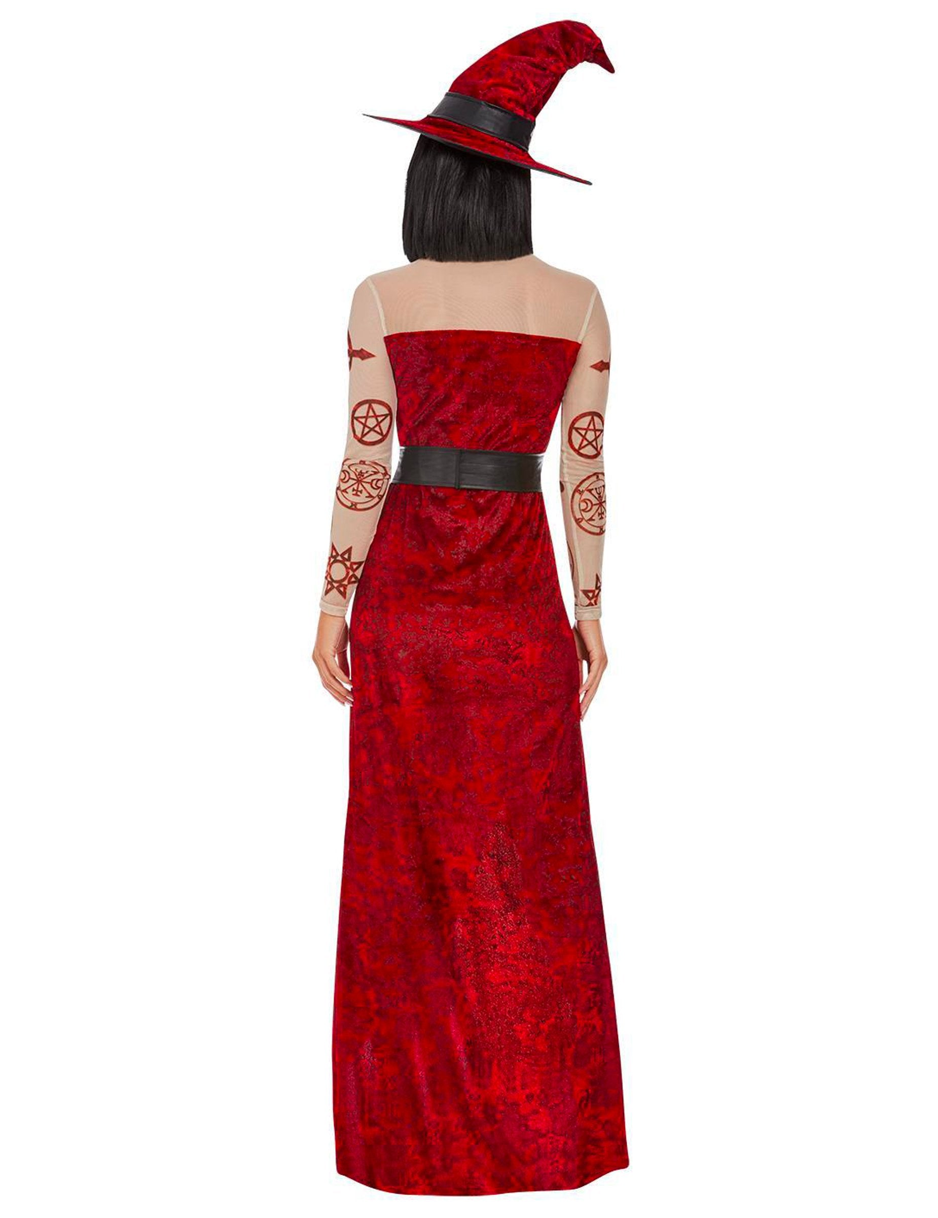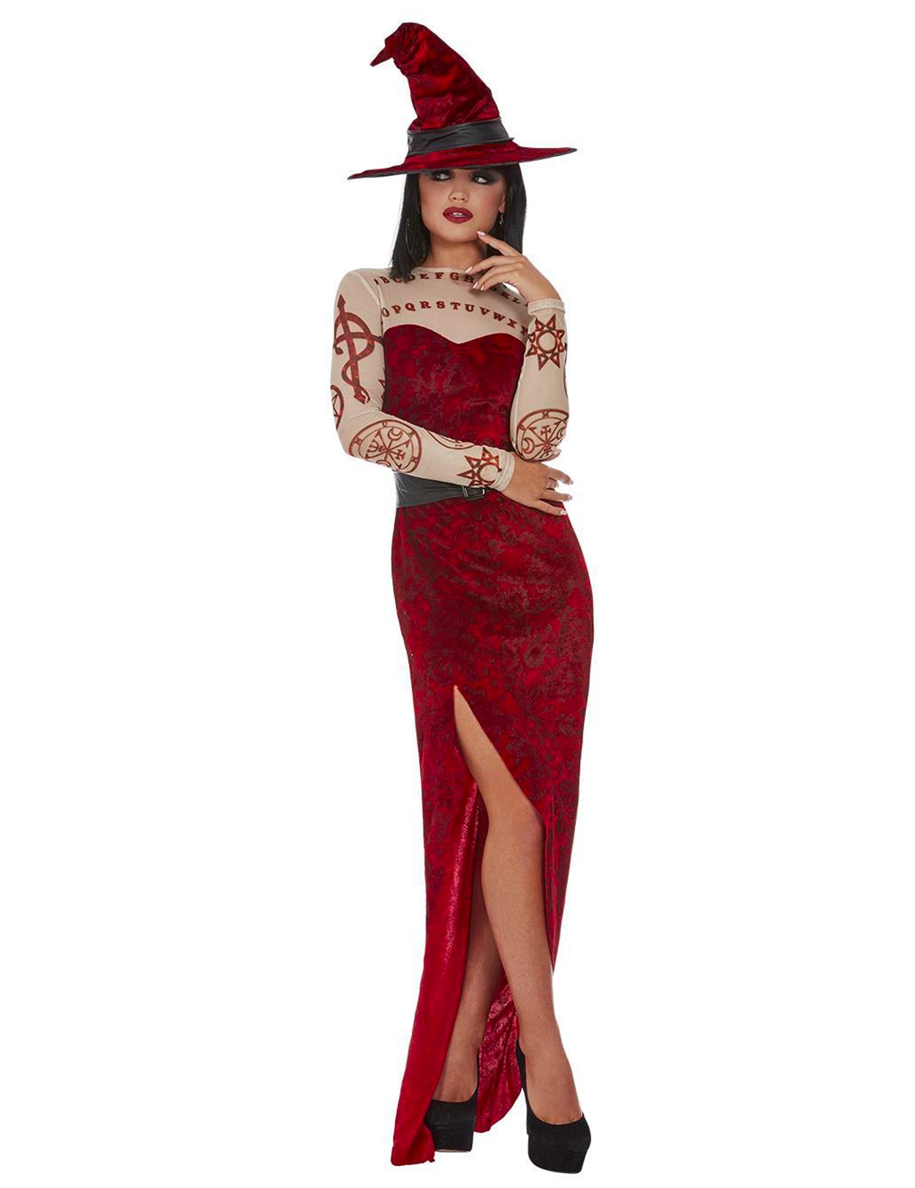Тази сатанинска маскировка за червена вещица е за жени и се състои от рокля, колан и шапка (чорапогащи и обеци не са включени). Горната част на роклята е червена, а ръкавите, а плътта -оцветена в шията придава илюзията за бюст. Азбуката присъства на яката като таблица Ouija, а ръкавите са покрити с мистични символи. Роклята е дълга и има прорез на нивото на бедрото. Черният колан и червената шапка допълват прикриването. Стартирайте заклинания на Хелоуин вечер с тази сатанинска маскировка за червена вещица!