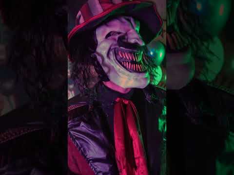Бялата маска разкрива широка уста с дълги пожълтели зъби, черни очи и тъмна средно дълга коса.