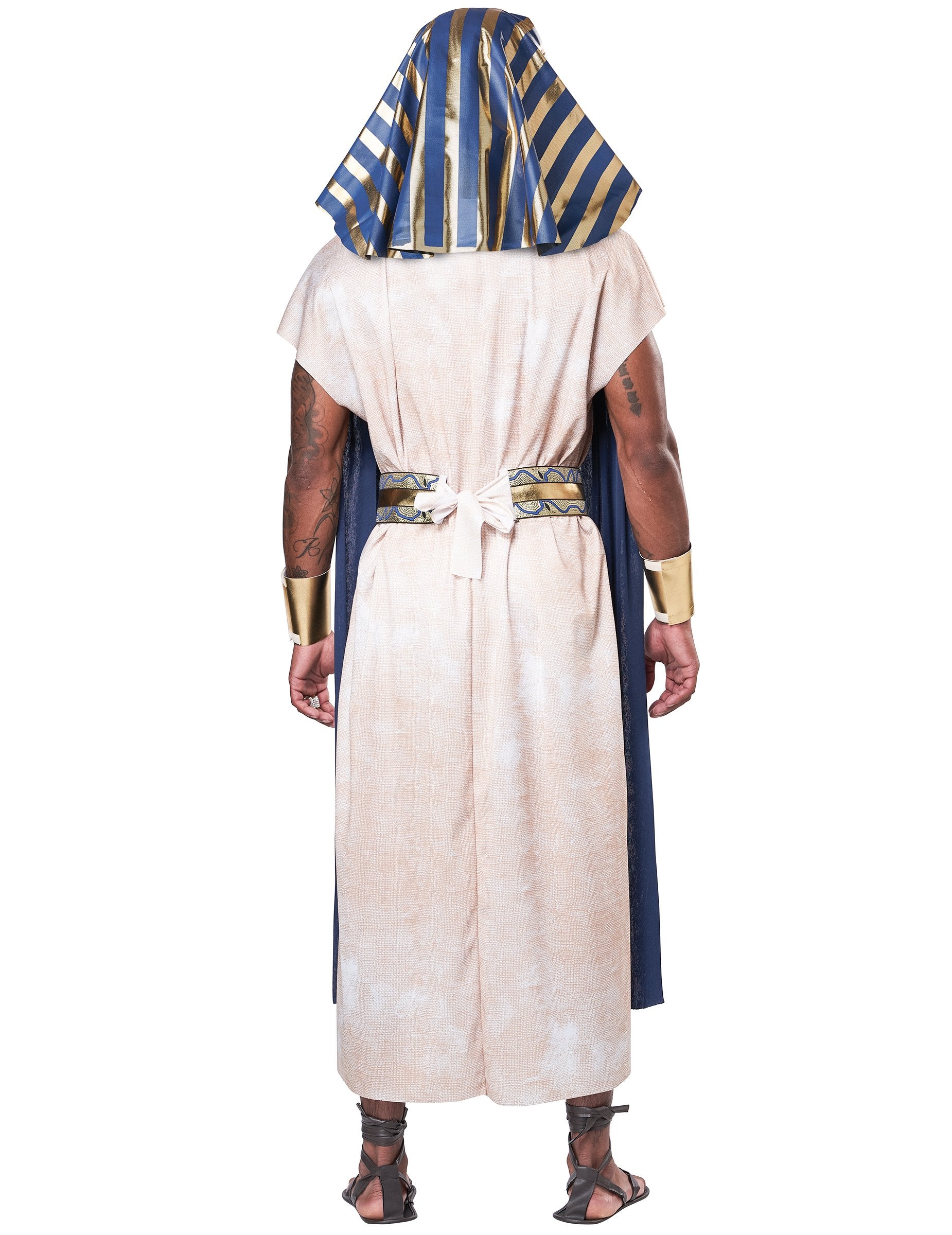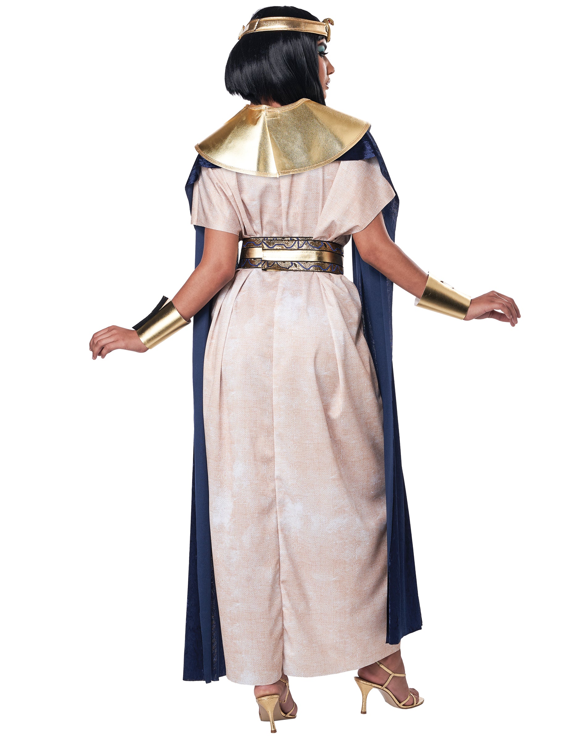 Този древен египетски костюм е за възрастни и смесени, жените и мъжете могат да го носят. Състои се от рокля, колан, чифт маншети, пластрон, дълъг шал, капачка и банер (скиптър и обувки не са включени). Роклята е напълно ecru с къси ръкави, върху които се отлага дълъг син кадифено шал, за да завърши египетското облекло. За аксесоари златният пластрон поема цвета на маншетите, но също така и коланът, който е украсен с арабески и участък от която покрива част от роклята вертикално. Шапката, от друга страна, е със сини и златни ивици и лента за глава, украсена със змия, идва да я държи на главата. Прикрийте се като египтянин на древността по -вярно от живота с този пълен костюм!