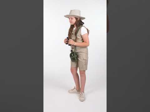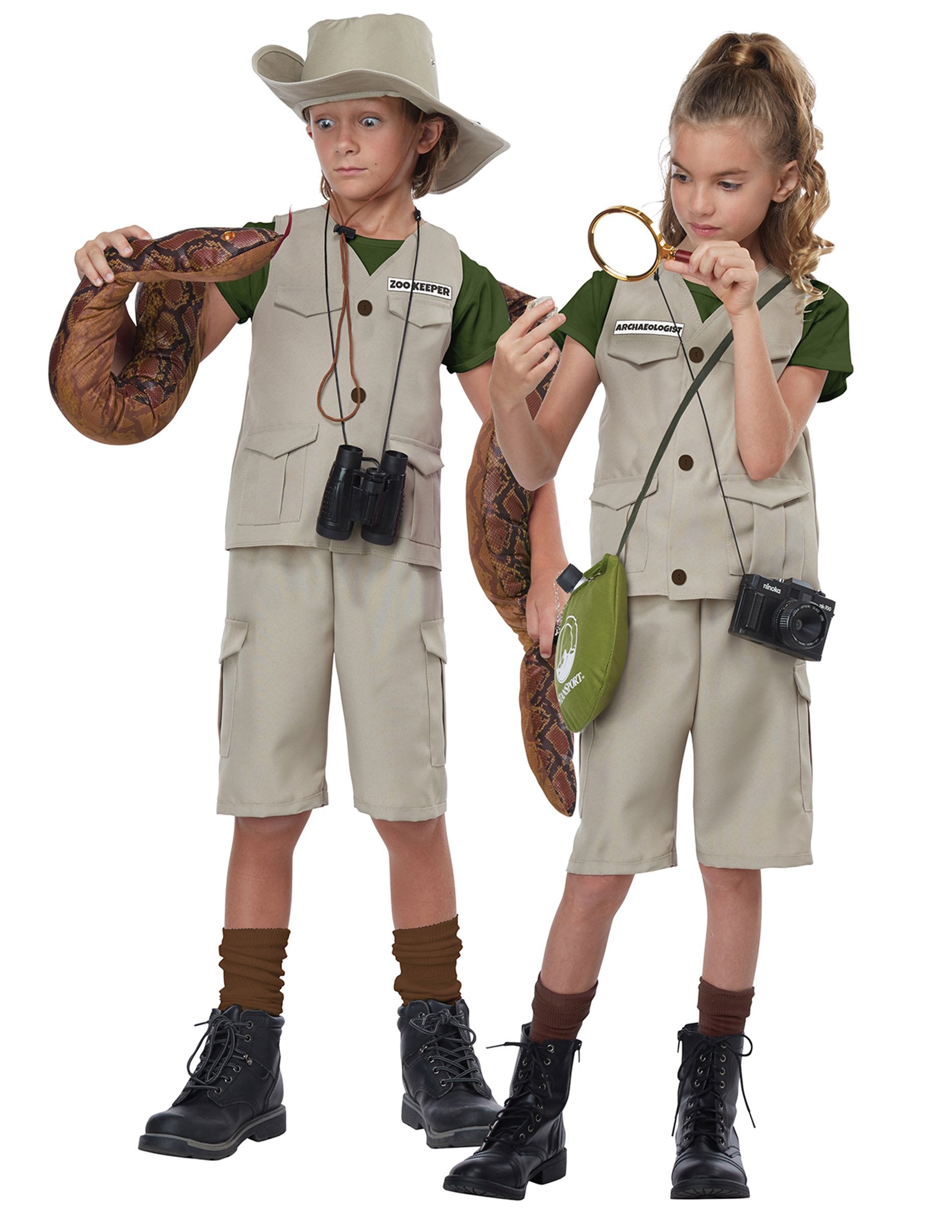 Този костюм на авантюристите е за деца. Състои се от яке, шапка, стикери с името на търговия (парк рейнджър, археолог, пазач на зоопарк, експерт по дивата природа) и къси панталони (Leta, близнаци, обувки и чорапи, които не са включени). Якето е изцяло бежово с фалшиви джобове и три копчета и зелена тениска е пришита на якето. Шортите възобновяват същия цвят като якето, както и страничните джобове. Шапката приема формата на шапките на авантюристи или каубои, с огънат ръб. Бинокълът завършва външния вид на авантюриста, докато стикерите идват да внесат малко реализъм в тоалета. Преобразувайте детето си в истински авантюрист за вечер, прикрита на темата за джунглата.
