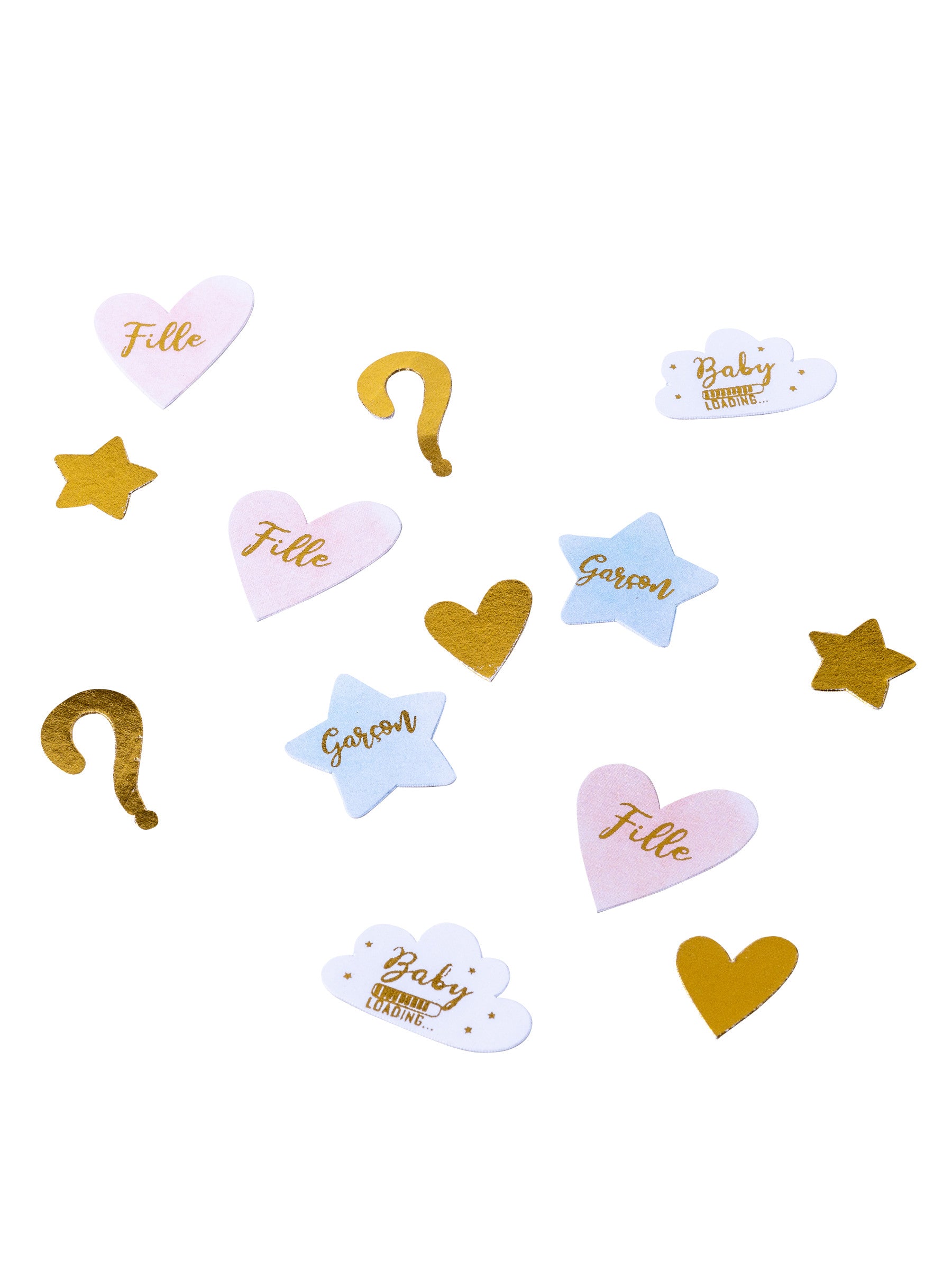 Подобрете празничната си трапеза с този комплект от 100 броя конфети момиче или момче, с размер между 2 и 3,5 cm. Тези декорации, в различни форми на звезди, сърца и въпросителни, са в розови, сини и златни нюанси за искрящ ефект. Разпръснете ги конфети е перфектният избор за бебешки душ запомнящи се. Те осигуряват основния завършек на вашите декорации по време на парти за разкриване на пола богат на емоции.
