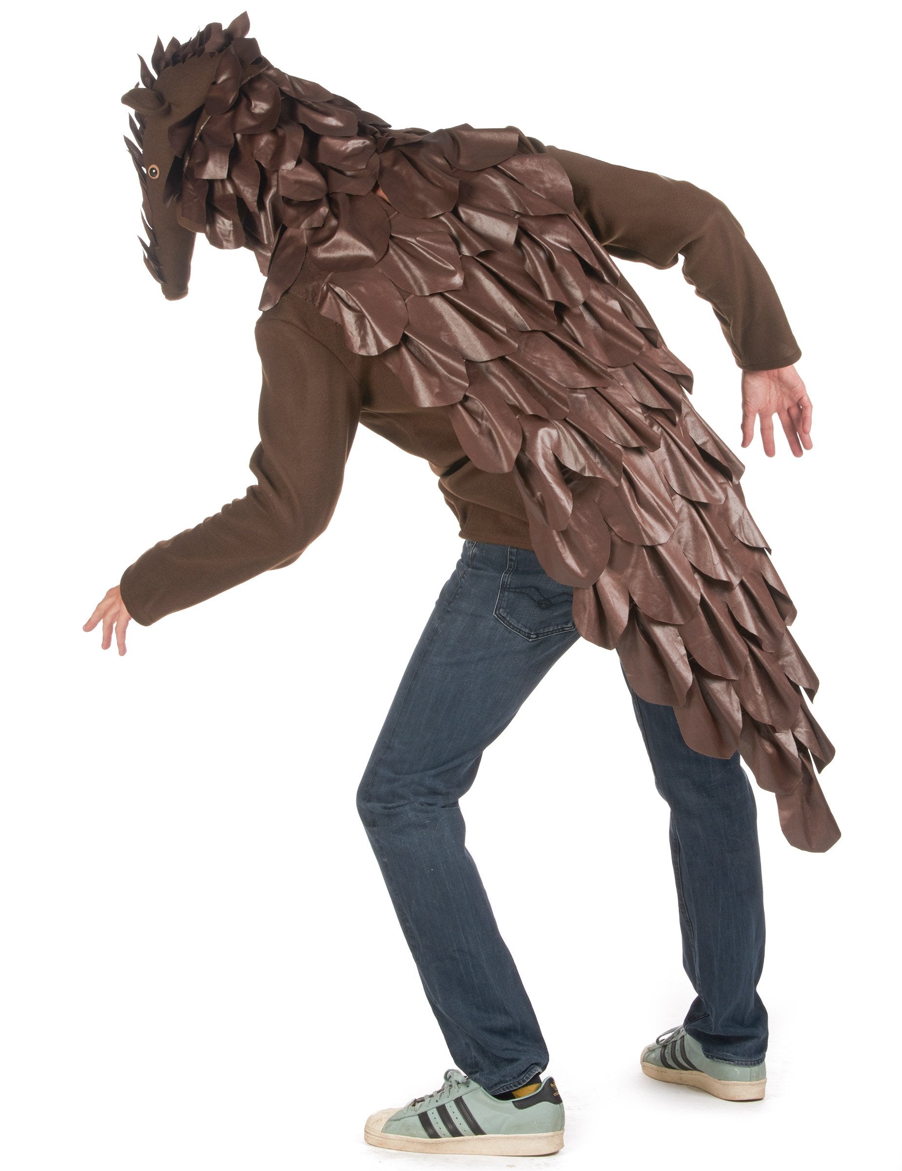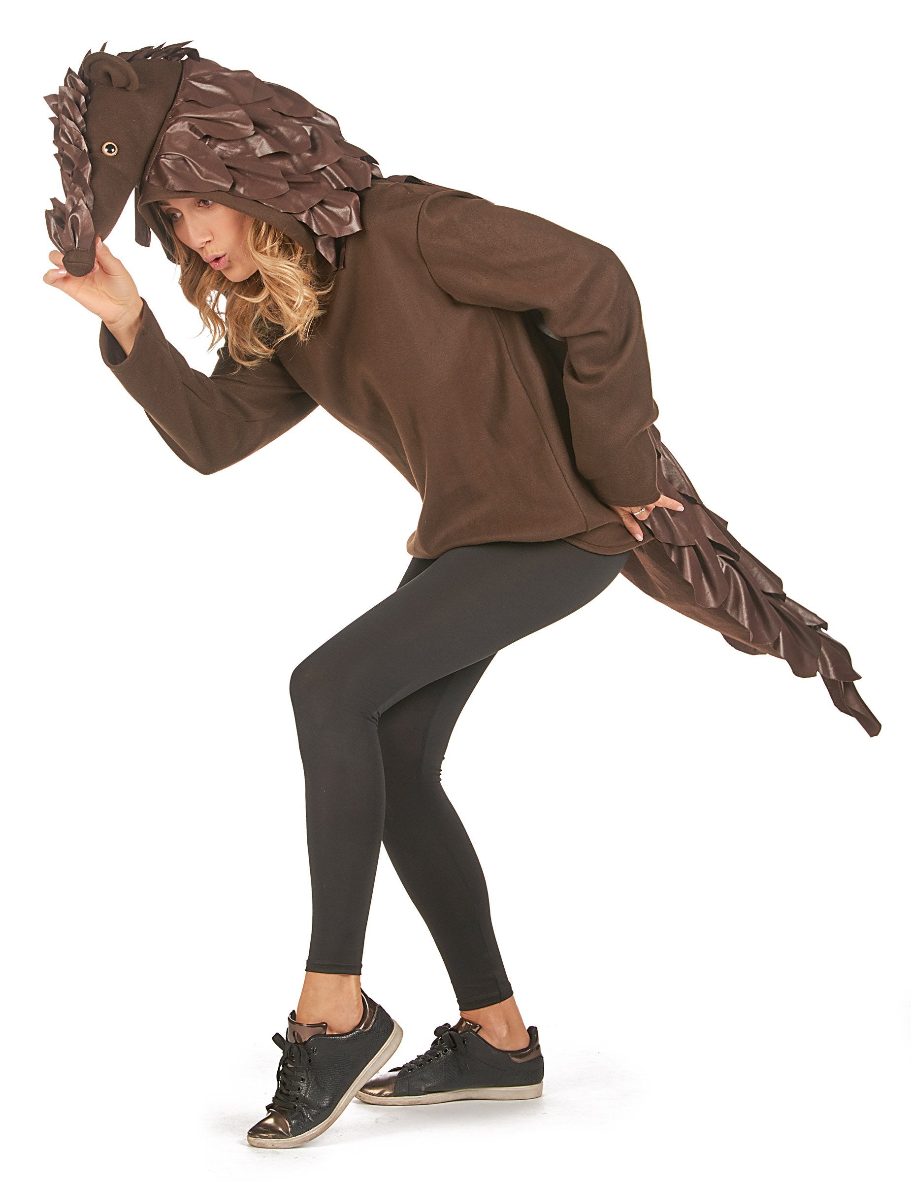 Този панголин костюм е за възрастни и се състои от високо (панталони, обувки и очила не са включени). Кафявият връх е дълъг -потапящ. Той има кафяви ярки везни на ефекта на гърба, както и качулка, представляваща главата на панголина в дългата муцуна. Този костюм на Панголин ще бъде идеален за оригинален по време на вашата Хелоуин вечер или за тематично парти!