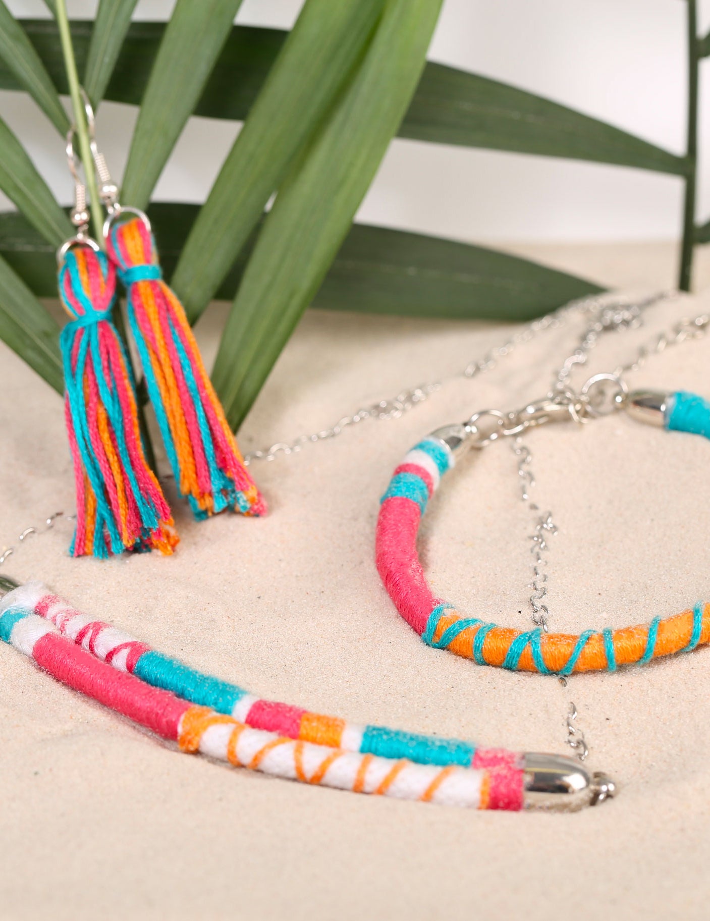 Като следвате инструкциите стъпка по стъпка, можете да сглобите колие, гривна, пръстени и обеци. Идеален за начинаещи, този комплект ви позволява да създавате зашеметяващи изделия. цветни бижута да се носи с гордост или да се подарява.