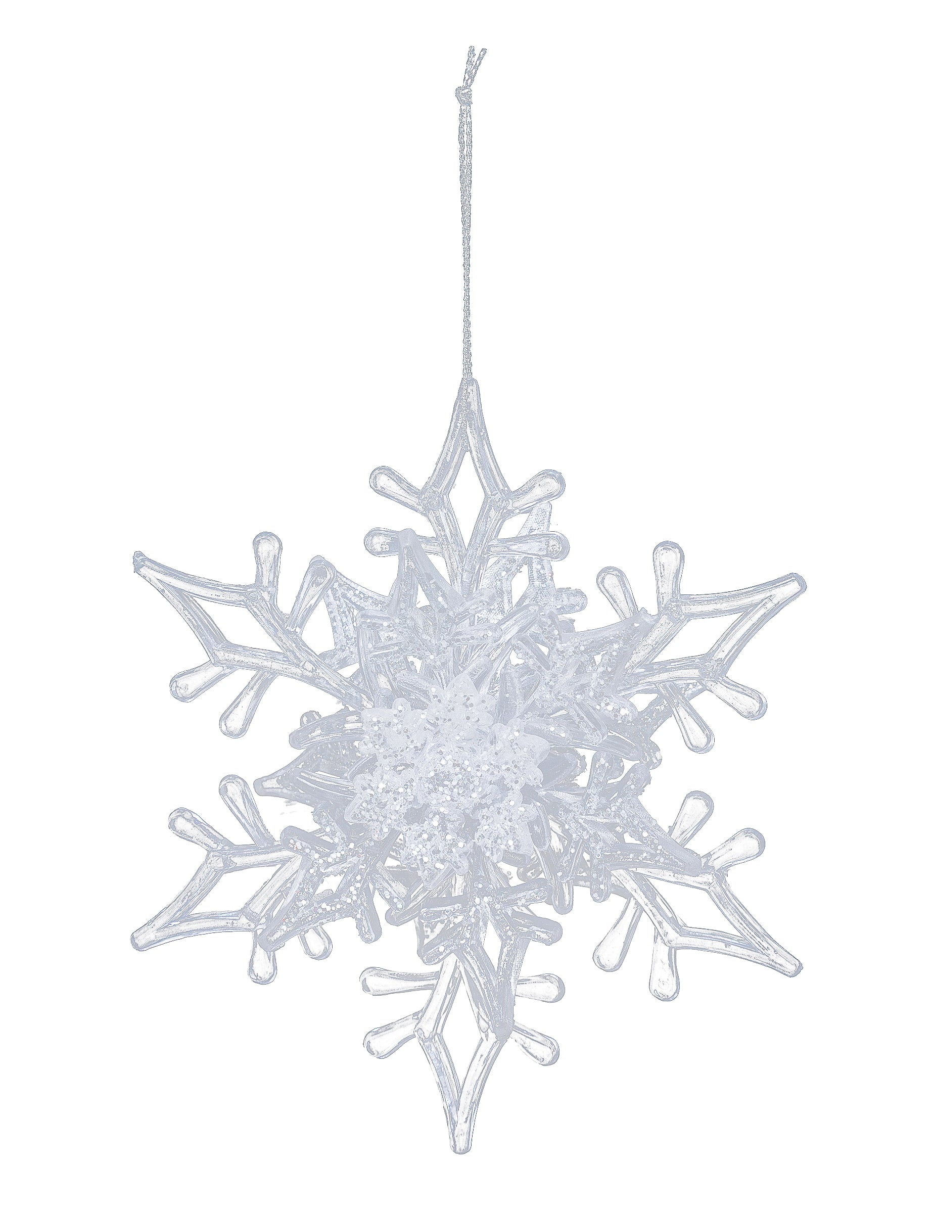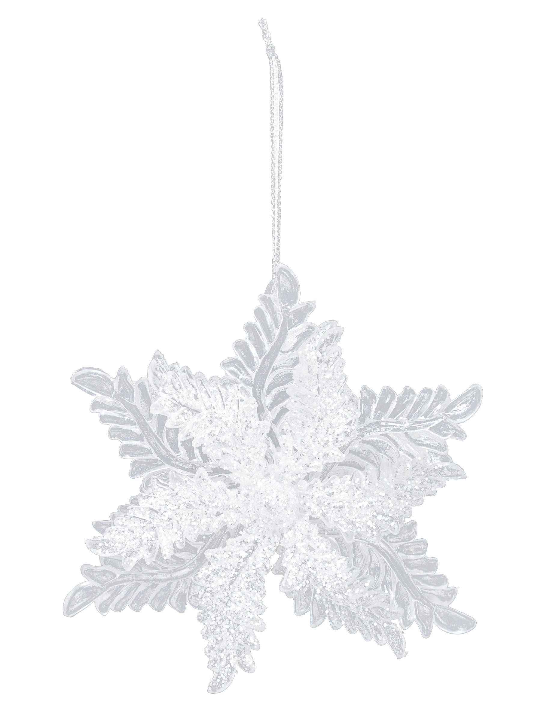 Тази висяща декорация е с диаметър приблизително 11 см. Той представлява снежинка с блясък. Снежинката може да има три различни форми, моделът е случаен. Тази висяща бучка е идеална за декориране на вашето коледно дърво в зимна тема!