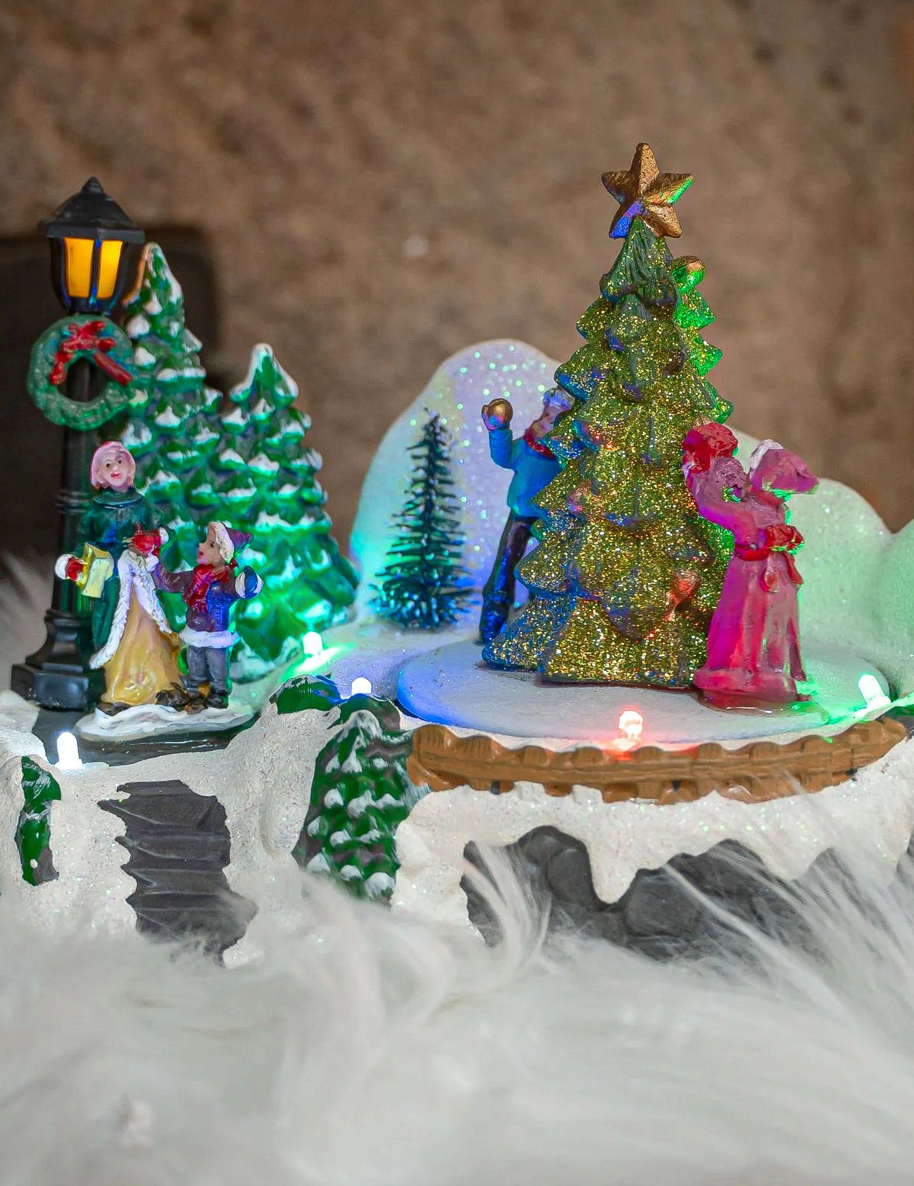Това осветено коледно село е с размери приблизително 18 x 12 x 13 cm. Тази лека декорация представлява част от коледно село с елхи, покрити със сняг, подова лампа и деца, които се забавляват, украсяващи дървото. Тя оживява и светва с батерии AA / LR6. Украсете дома си за Коледа с тази лека декорация!