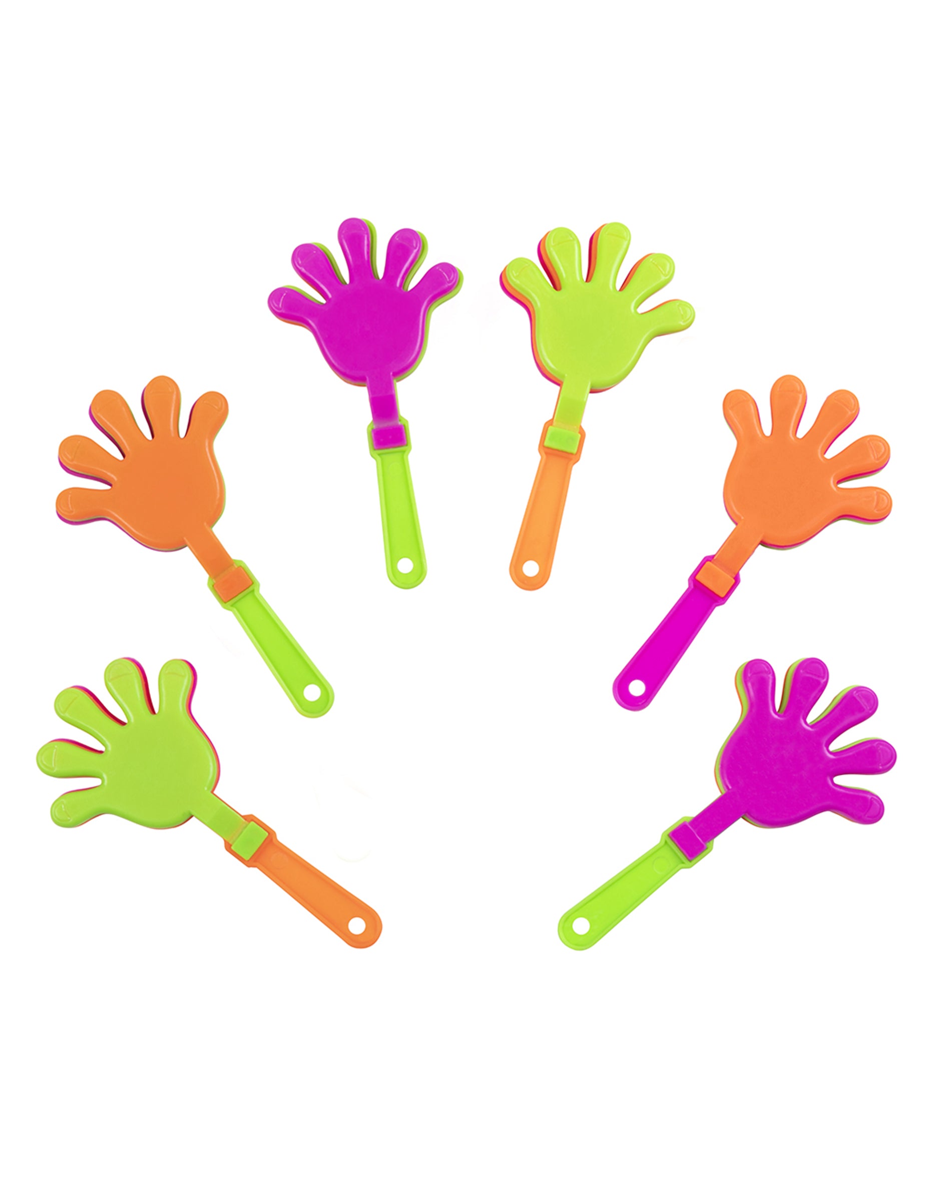 Открийте този комплект от 6 мини ръкопляскания Оцветено в розово, зелено и оранжево. Размери 9,5 x 4,5 cm, тези малки играчки са идеални за пълнене на пинята или торбички за лакомства рожден ден.