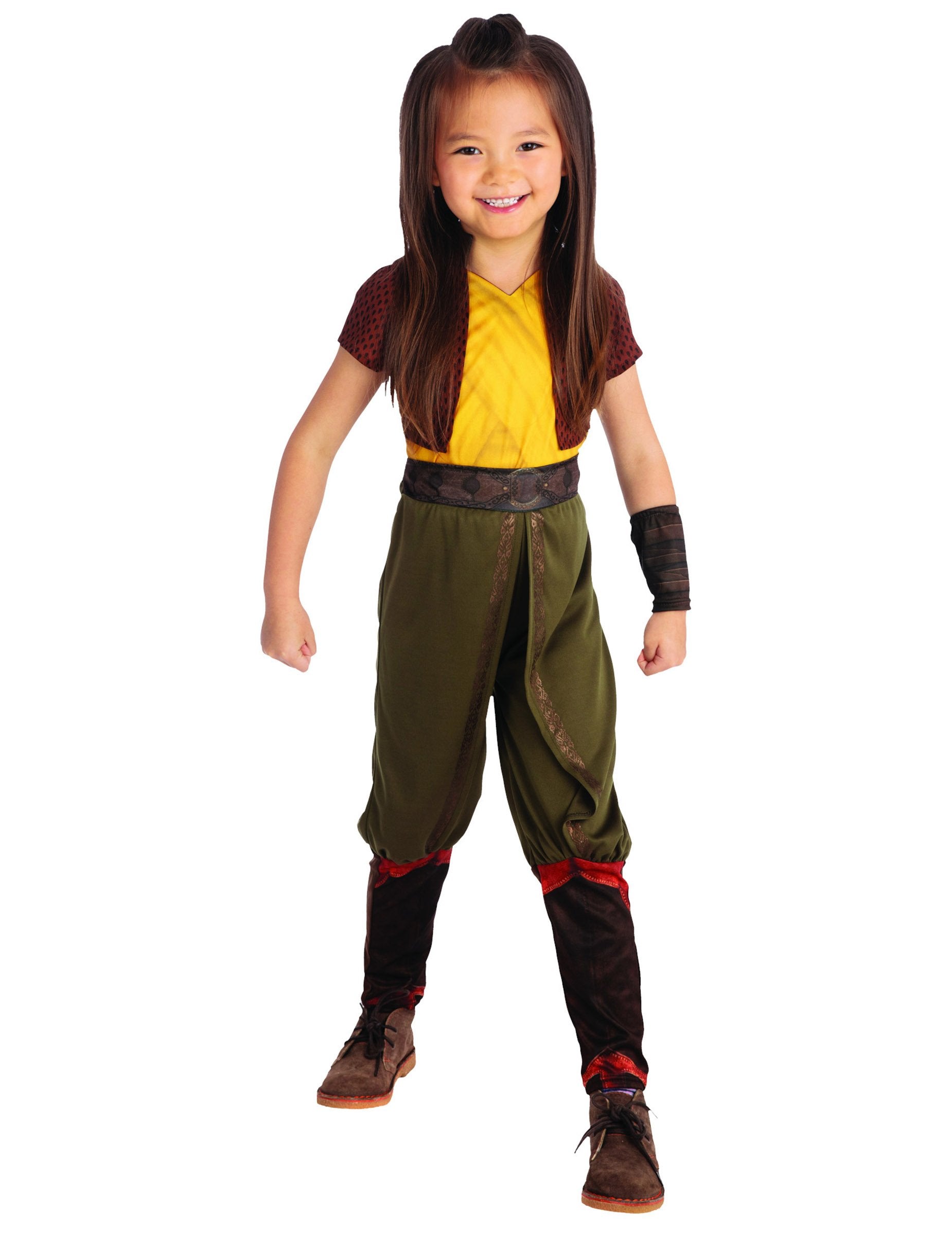 Този костюм на Raya за момиче е под официалния лиценз на карикатурата Raya и The Last Dragon. Има връх с яке, пришито върху него, панталони и ръкав. Горната част е жълта на цвят с доста V -нек. На върха се пришива къса кафява жилетка. Панталоните са в зелена материя от Khaki с доста щампи и фалшив колан, които носят Cahcet в този доста характер на характера на въображаемото кралство на Кумандра. Удвоява се за драпиран ефект. Дъното на панталоните имитират чифт кафяви походки, граничещи с оранжево. В ръкава е изработен от кафява тъкан с походки. С този костюм на Raya ще бъде идеален за въплъщение на анимационен герой на рожден ден на прикрита вечер.