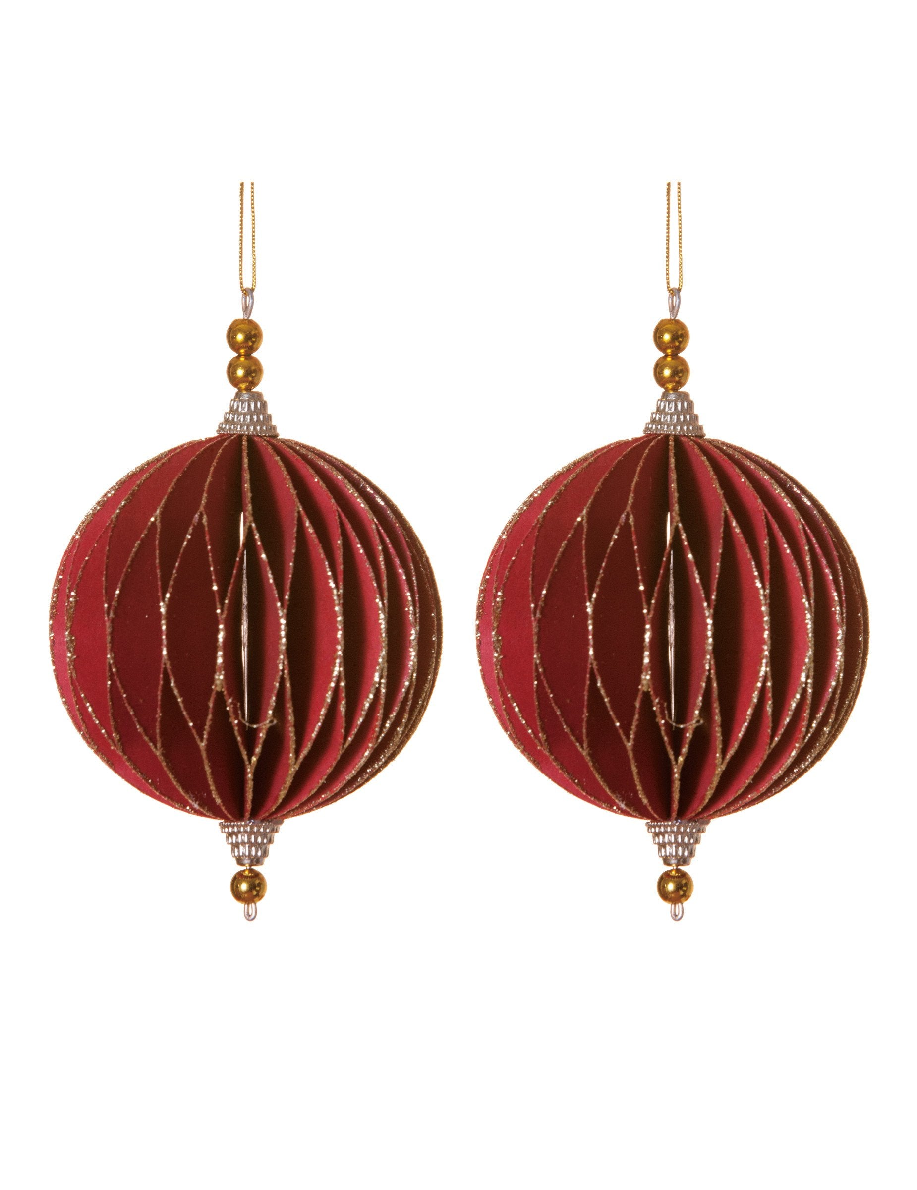 Тези декорации, които се окачват с диаметър около 13 см, се продават в много 2. Те имат формата на оригами и са червени и златни на цвят. Попълнете декорацията си с тези висящи декорации, за искрящо коледно дърво!