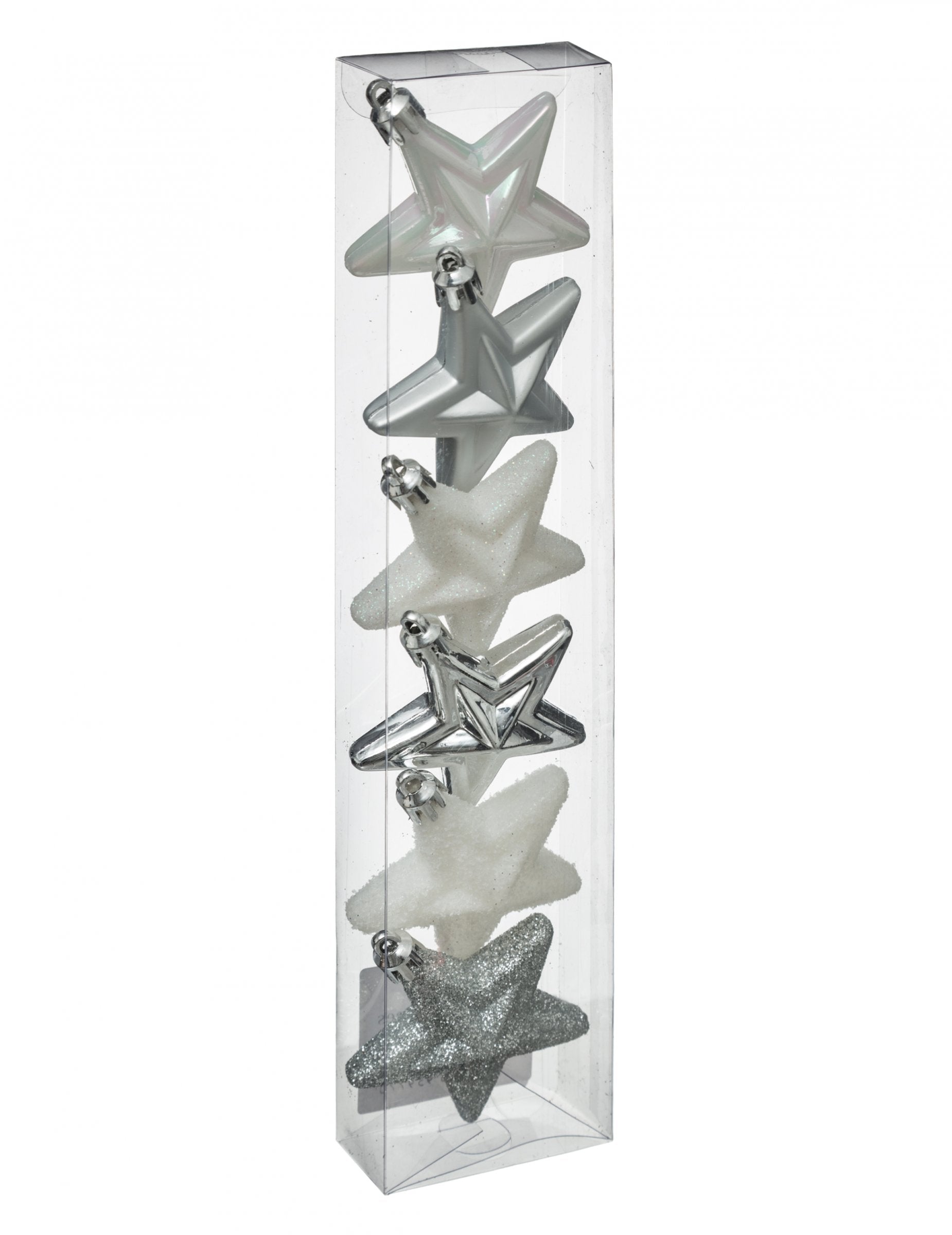 Украсете дома си с елегантност благодарение на този комплект от 6 Украси за коледна елха от 6 cm. Тези орнаменти във формата на звезда са украсени в бяло и сребристо с матови, гланцови и блестящи покрития. висящи лампи във формата на звезда ще преобрази декора ви, за да му придаде полярен вид по време на Коледни тържества.