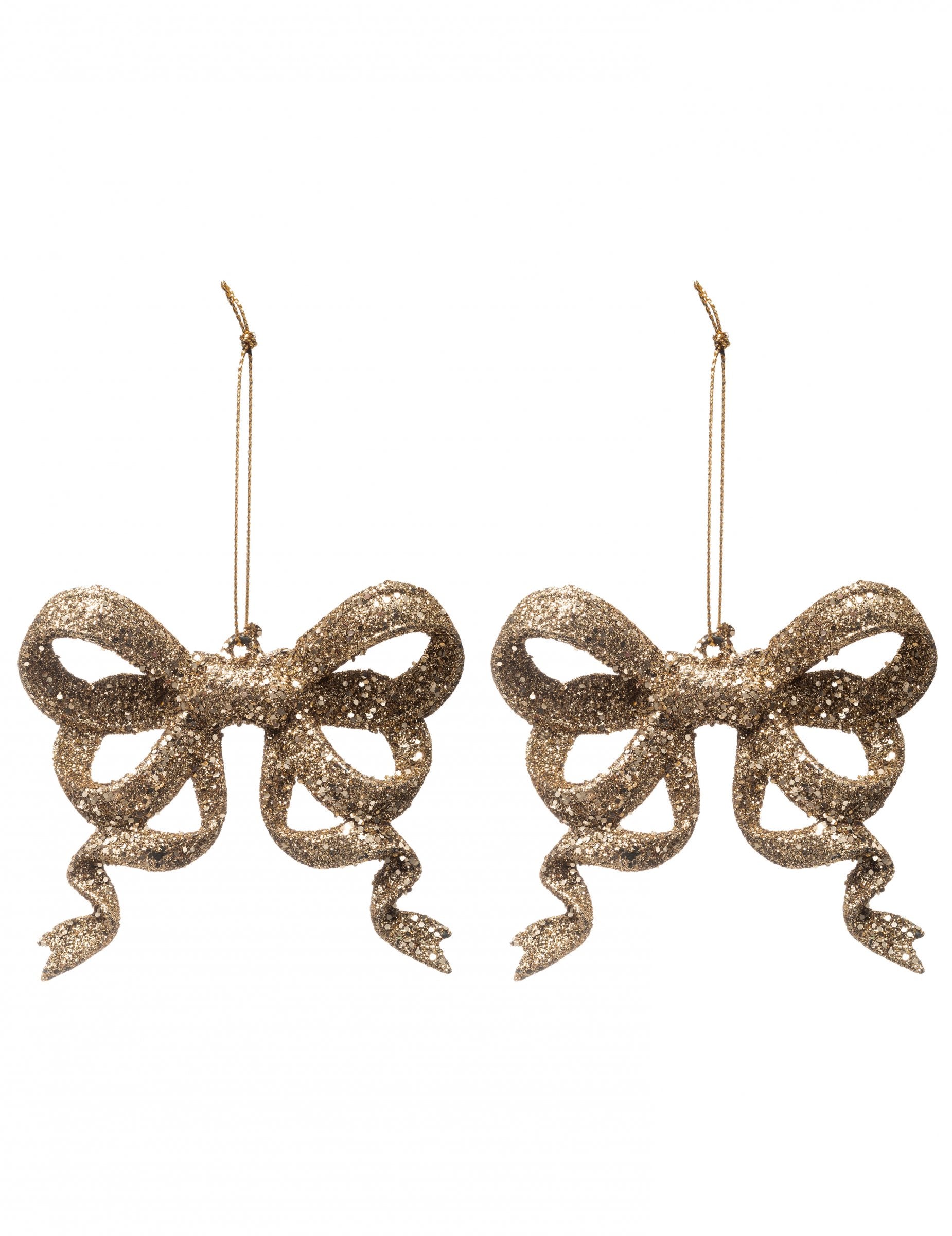 Embellissez votre arbre de fêtes avec ce lot de 2 suspensions mesurant 9 cm. Chaque noeud est magnifiquement orné de paillettes dorées pour un effet scintillant. Ces noeuds à suspendre sont l'accessoire idéal pour une décoration de sapin élégante et festive lors de Noël.