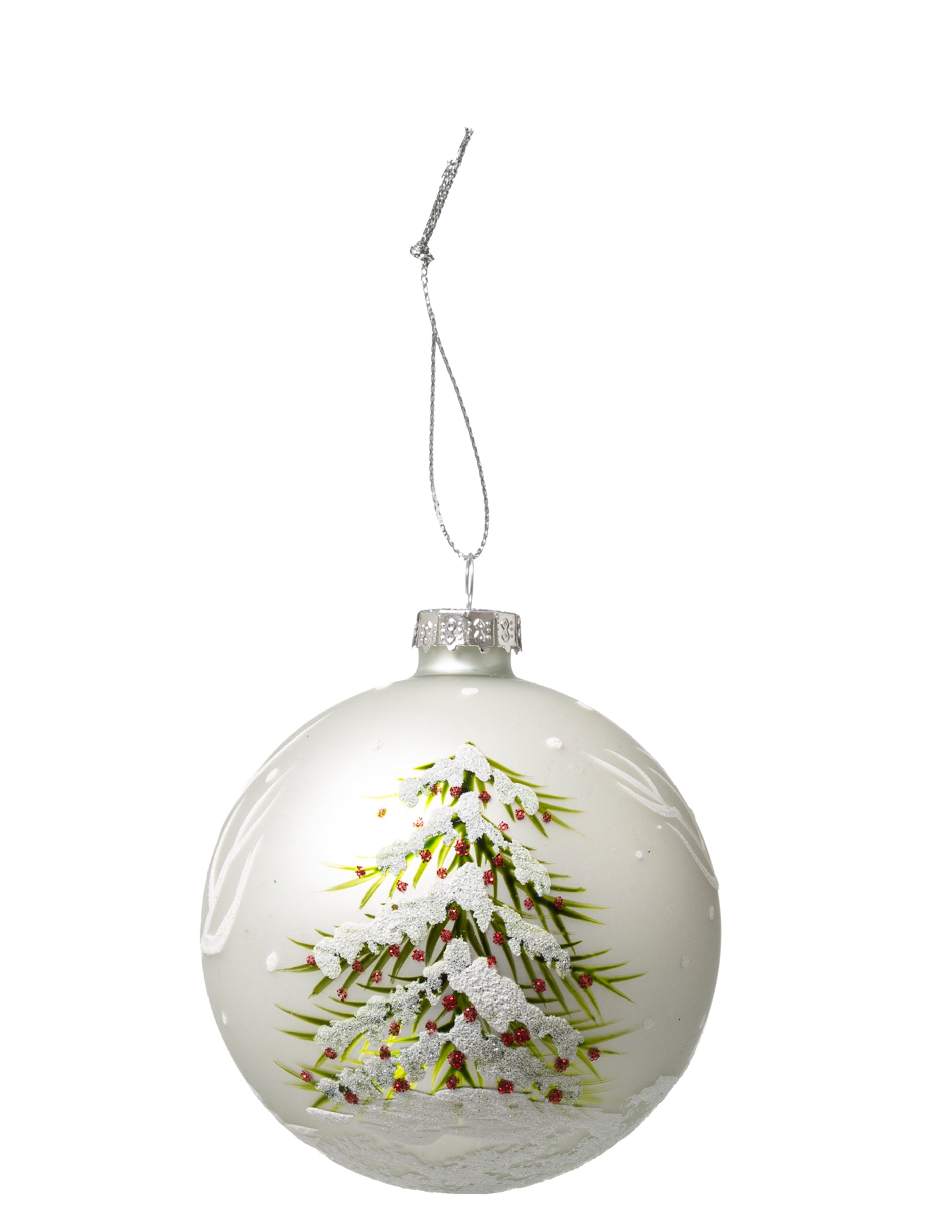 С диаметър 8 cm, това Коледна топка е изработена от бяло стъкло. Декорацията ѝ изобразява ела Ръчно рисувана е за автентичен вид. Добавен е бял брокат, който ѝ придава красив снежен ефект. Идеална е за добавяне на завършек към вашите декорации. Коледна елха с елегантност.