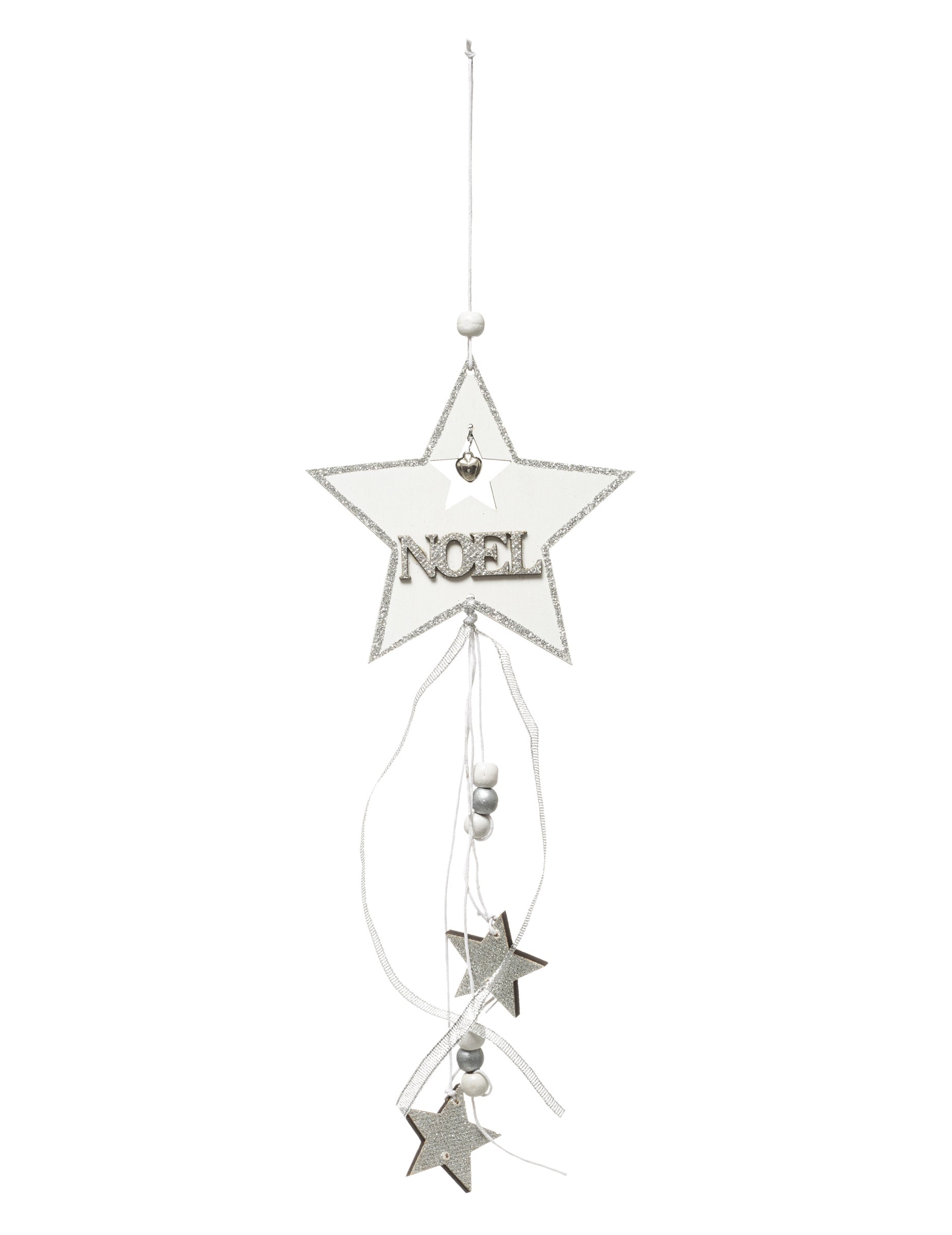 С височина от 35 cm, това окачване се отличава с голямата си звезда централно показване на съобщението КоледаСребърни елементи във формата на звезда са деликатно прикрепени към панделки за ефирен ефект. Закачете това звезда за да добавите нотка магия към вашето Коледна украса.