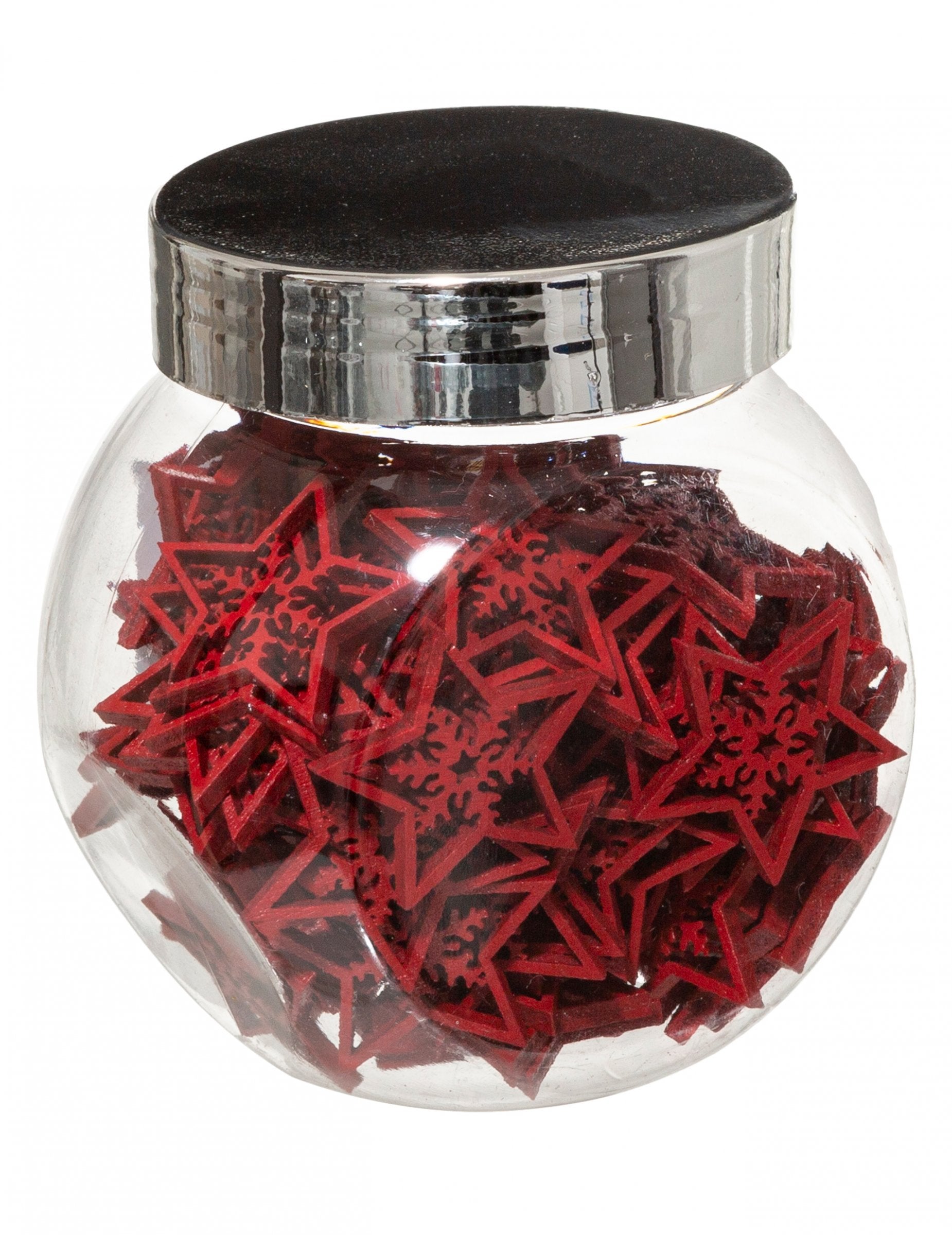 Този буркан е с размери приблизително 7,6 х 5,5 х 7,7 см и съдържа 100 малки дървени декорации. Те са във формата на звезда, червена и украсена в центъра на снежинка. Тези малки звезди ще дадат на вашата маса традиционна атмосфера за празненства в края на годината!