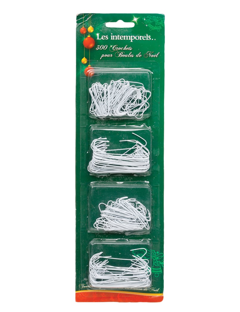 Този комплект се състои от 300 куки за коледни топки. Ще намерите 2 различни размера: 150 куки с дължина 10 см и 150 куки с дължина 7 см. Те имат случаен цвят между бяло, черно и зелено. Благодарение на тези куки, вашите топки и вашите висящи декорации бързо ще заемат мястото си във вашето коледно дърво!