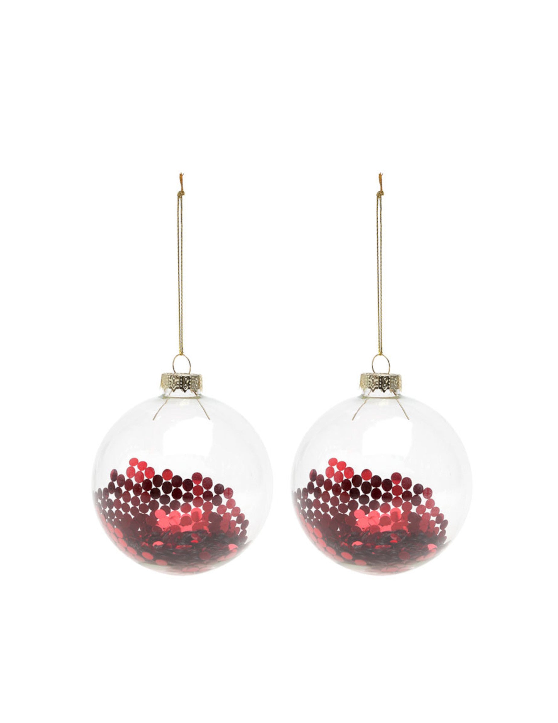 Този комплект включва две топки Коледни орнаменти, изработени от полупрозрачно стъкло. Всяко парче е с диаметър 8 cm и съдържа красив червен брокат за искрящ ефект. блестящи топки ще внесе блясък и нотка елегантност във вашия Коледна елха по време на празничния сезон.