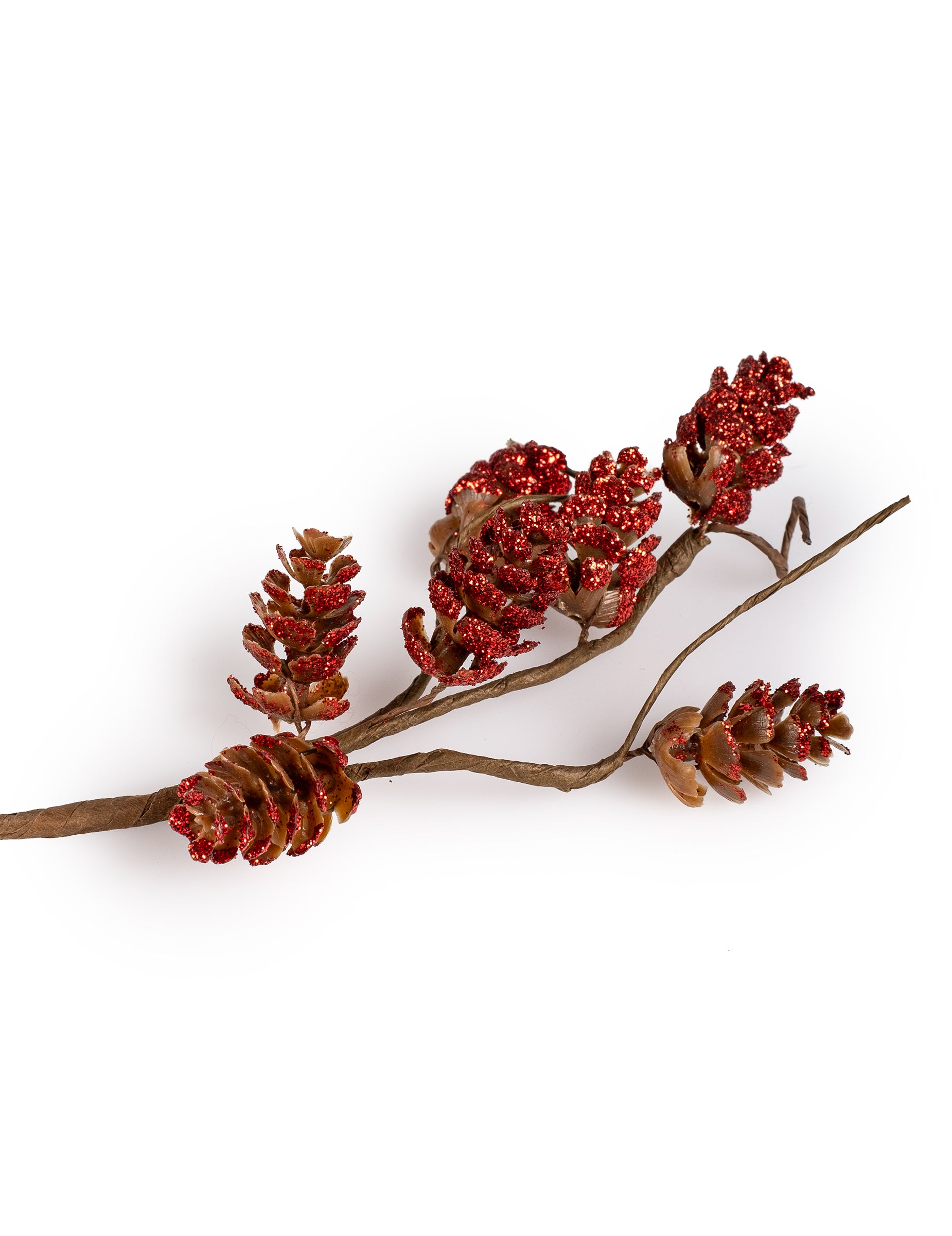Apportez une touche d'éclat à vos festivités avec cette branche ornée de pommes de pin et de paillettes rouges scintillantes.