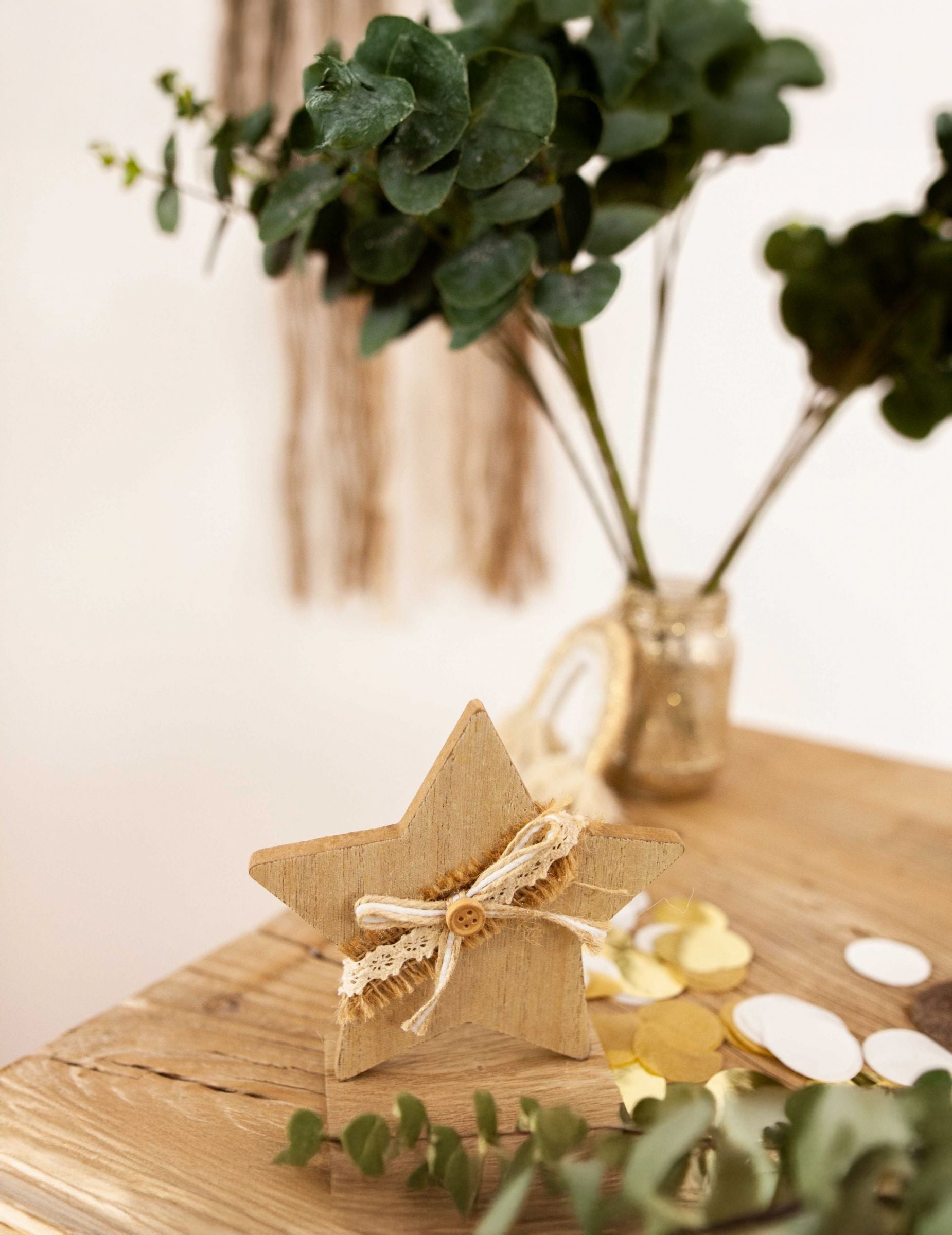 Декорация звезда от дърво, юта и дантела 13 cm
