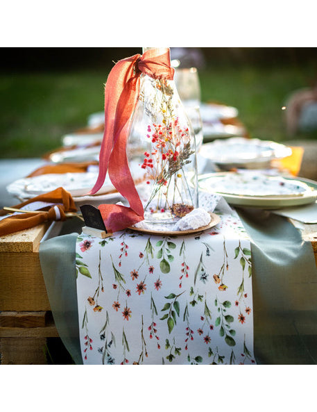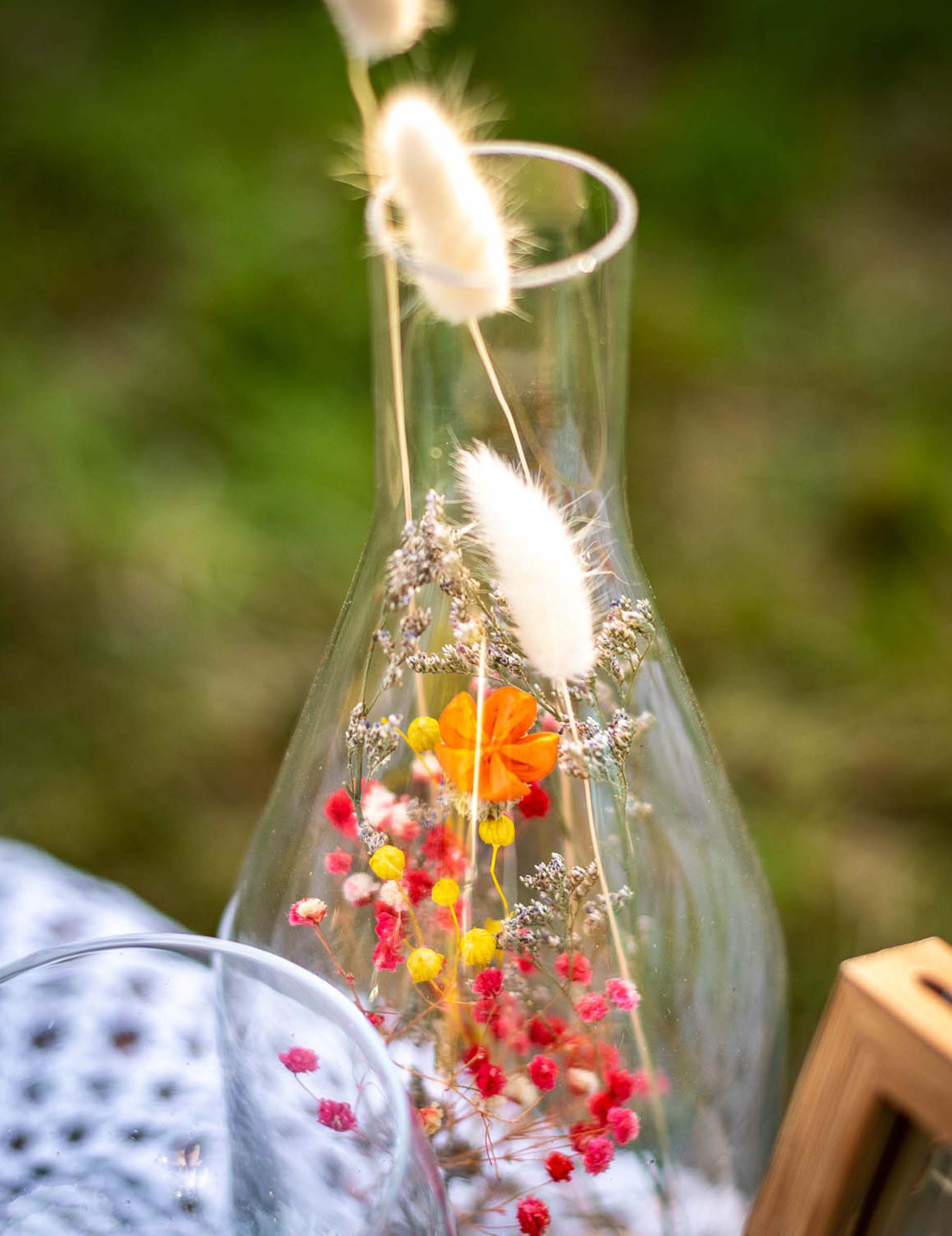 С размери 32 x 12 cm, Този прозрачен стъклен контейнер показва композиция от клони и сухи цветя в различни нюанси. Това бутилка с цветя е идеалният декоративен аксесоар, който да подобри вашето селска сватба служещ като елегантен и естествен централен елемент.