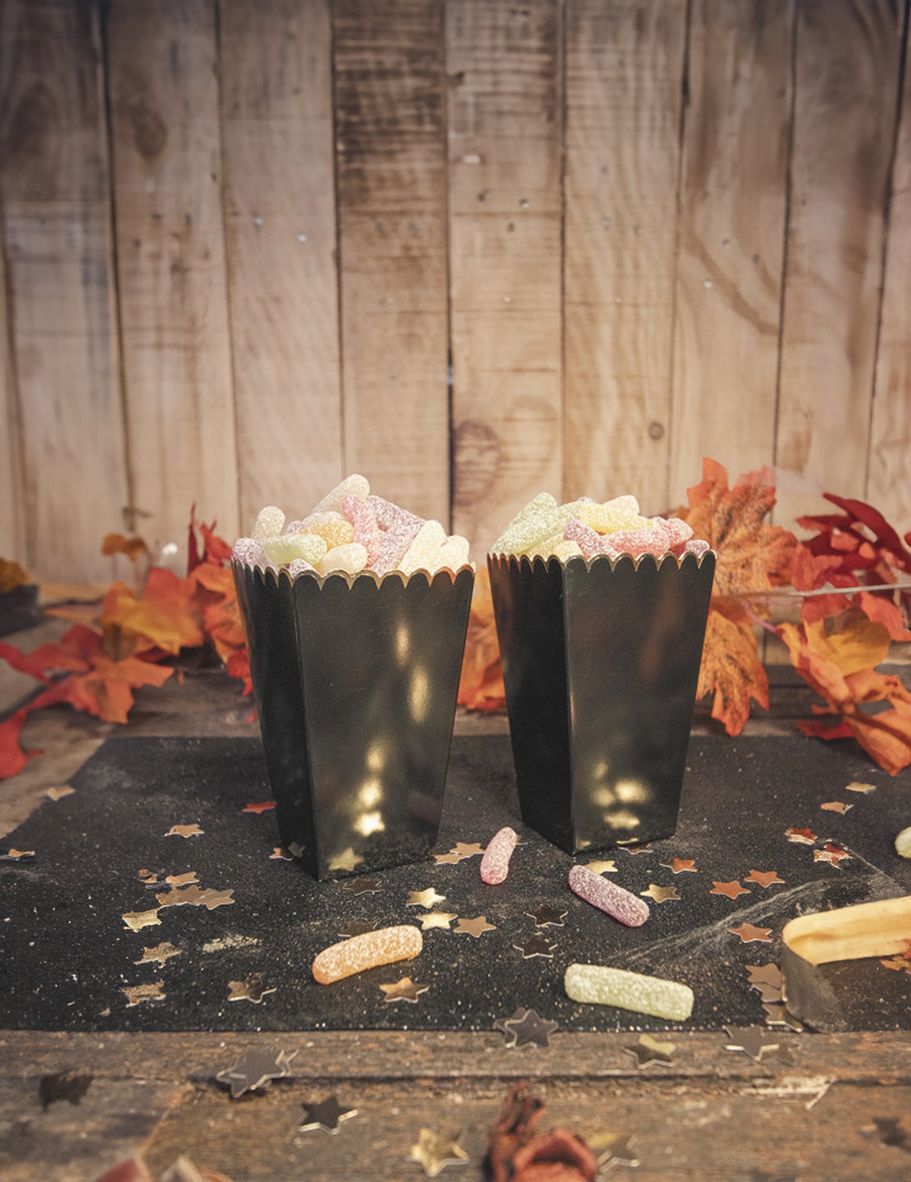 Ce lot comprend 8 boîtes à pop-corn en carton d'une taille de 12,5 x 7 cm. Leur coloris noir est mis en valeur par des bordures dorées au style festonné. Ces contenants sont parfaits pour accueillir des friandises ou des cadeaux lors d'un goûter d'anniversaire ou pour célébrer Halloween.