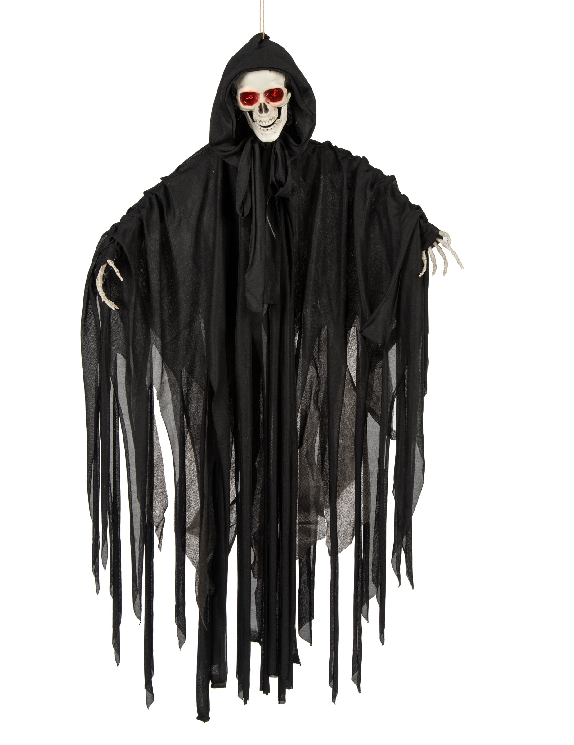 Този ярък, звуков и анимиран скелет на Хелоуин е с височина приблизително 90 см. Тази декорация, облечена в черно, има маска от скелет тип с червени очи и скелетни ръце. Разкъсаната тъкан от ефект, добавя още по -мрачна за цялото, можете лесно да го закачите, където искате, да използвате кабел, разположен над пластмасовата глава на скелета. Когато призракът чуе да звучи наблизо, той ще започне да се движи и да издава звук за спиращия дъха реализъм! Ще е необходимо да внесете 3 батерии AA, за да поставите декорацията си в експлоатация. Това спиране ще бъде от обстоятелство, за да зададете тона на вашата ужасна вечер по време на вашето парти за Хелоуин!