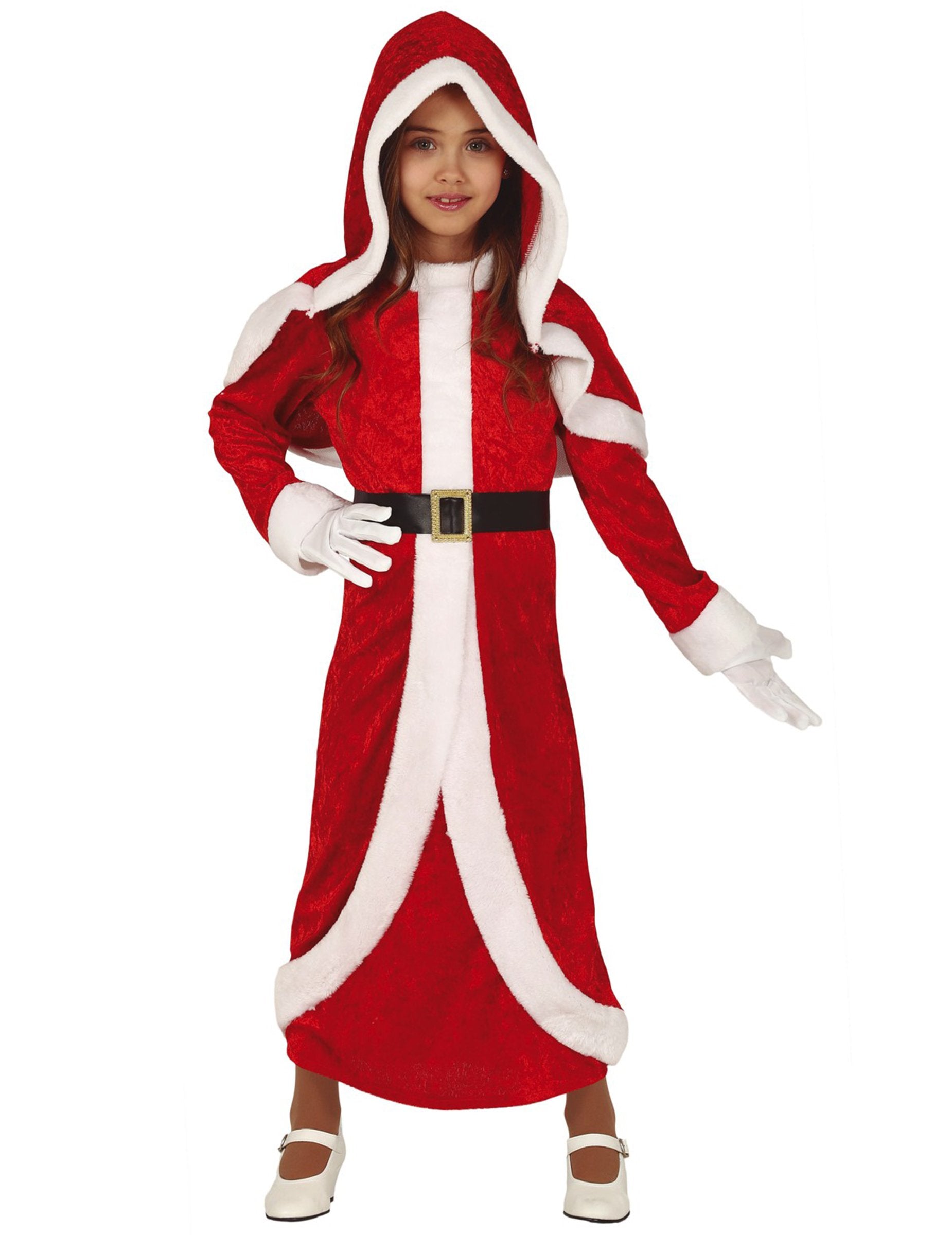 Този коледен костюм на майка е за момиче и се състои от рокля, нос и колан. Дългата рокля е червена на цвят и има кадифена външен вид. Ръкавите са дълги и декорирани с бяла граница на китките. Черният колан със златист контур завършва маскирането. Кейп е червен и също има кадифе. Той е украсен с бяла граница. Този коледен костюм на майка ще бъде идеален за празнуване на Коледа с дъщеря ви!
