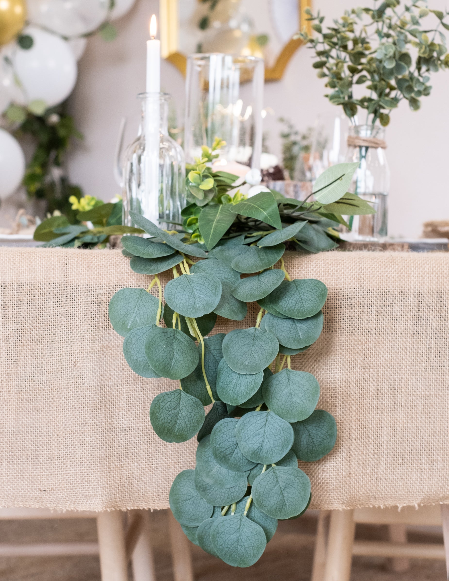 Добавете нотка природа към вашето събитие с това гирлянд Дълга 2 метра. Украсена с наситенозелени листа от евкалипт, тя е идеална за декориране на стените ви или за елегантна пътека за маса. евкалипт гирлянда е перфектният аксесоар за подобряване на декорацията на брак, от кръщение илирожден ден със стил.