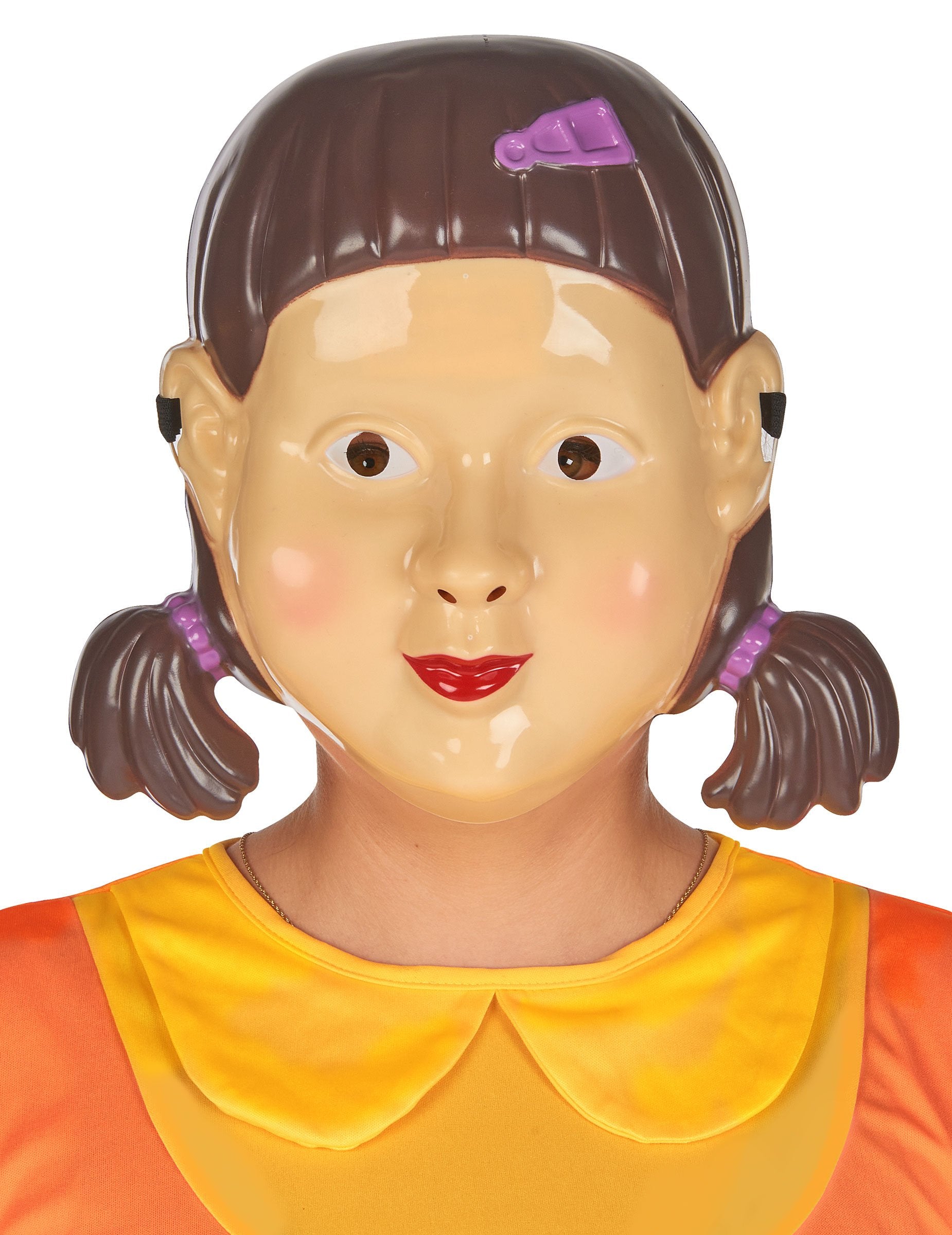 Тази маска за кукли убиец е за възрастни. Кръгла форма, маската е плоска и кафява, бежово, лилаво и червено. Две дупки присъстват на нивото на очите, за да се носят добра видимост. Играйте известната кукла убиец от любимата си корейска серия за прикрита вечер като Хелоуин, Карнавал или за Нова година!