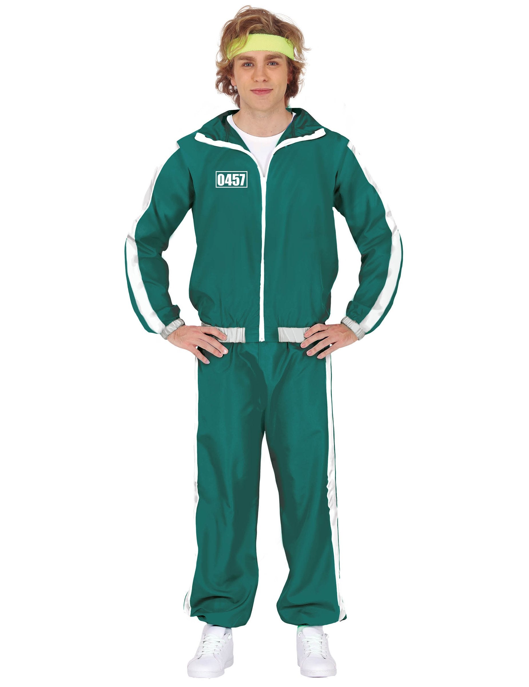 Този зелен костюм от участник номер 457 е за мъже. Тя включва яке и панталони. Отпечатаното яке има номера "0457". Комплектът е зелен на цвят и включва бели линии по панталоните, както и върху якето. Якето се затваря с обикновен цип. Участвайте в известната корейска игра и станете незабележим актьор по време на прикритата си вечер за карнавал или за Нова година!