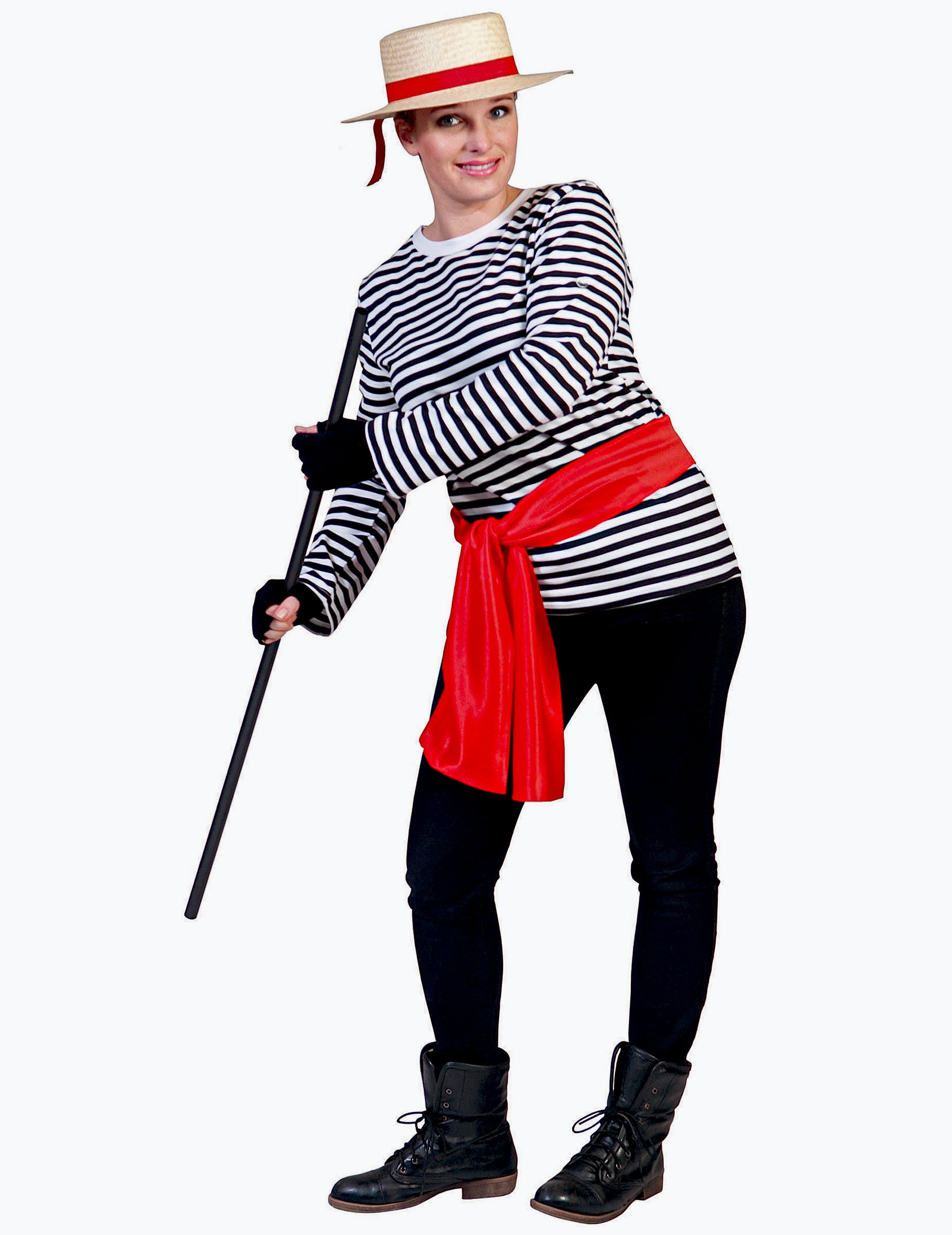Тази тениска на MIME е за възрастни. Има дълги ръкави и е декориран с черно -бели ивици. Тази тениска ще бъде идеална за завършване на вашия MIME или затворник за карнавал.