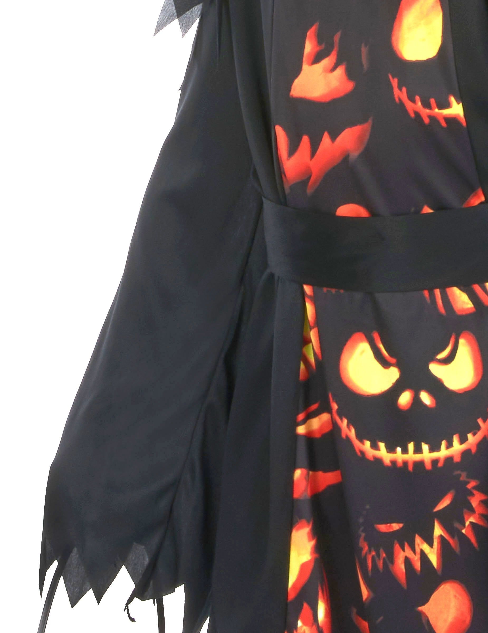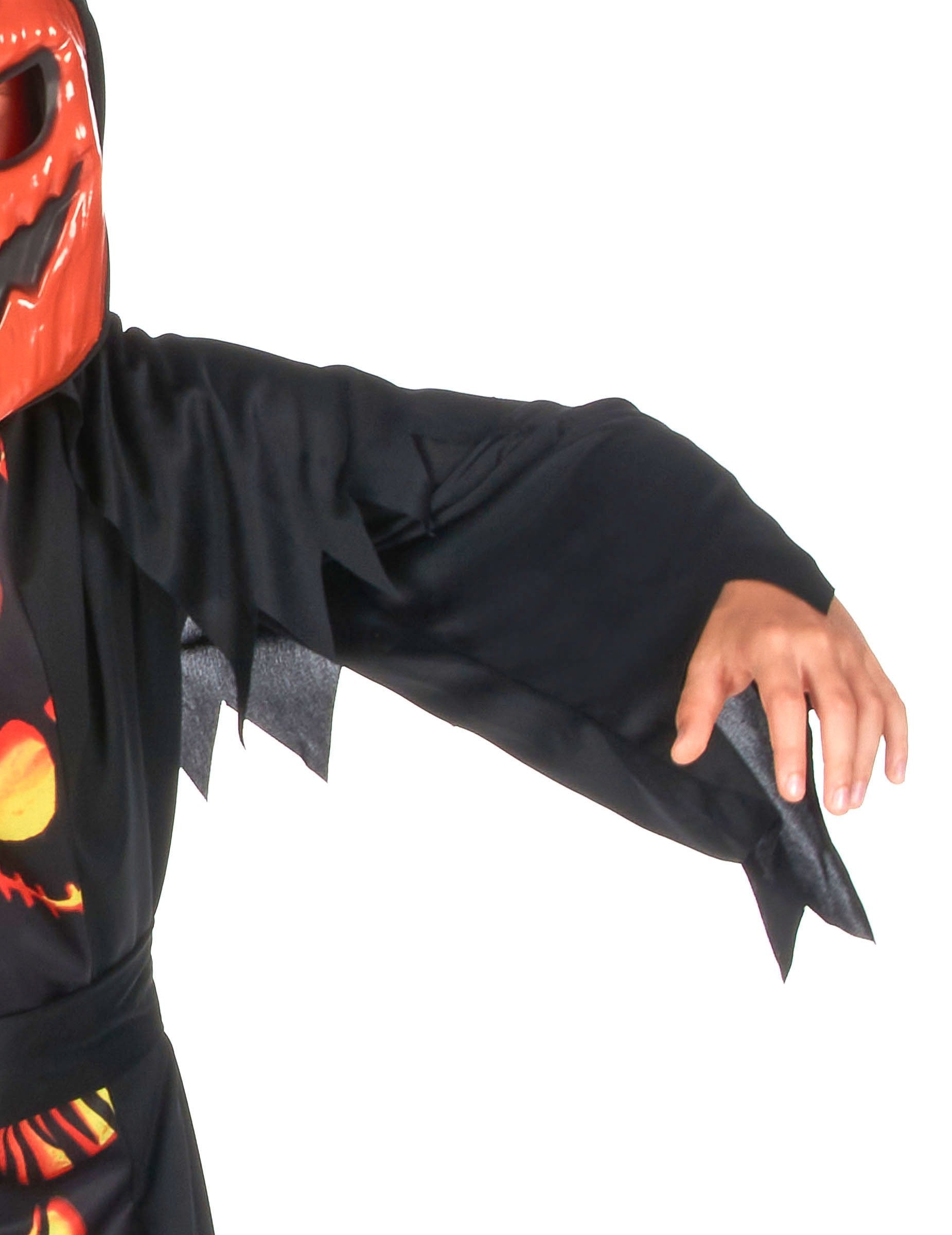 Тази страховита маскировка на тиквата е за деца. Тя включва рокля, колан и маска. Роклята с костюми е дълги ръкави, черни и оранжеви цветове. Той е декориран с множество модели с тиквени форми. Нарязва се на съвети на дъното и в ръкавите. Има черен цветен колан и ще дойде да се върже около кръста. Накрая полумаска във формата на тиквена глава ще завърши цялото. Той е оранжев и черен на цвят, придружен от дупки в очите и устата. Този тиквен костюм ще бъде идеален за Хелоуин вечер на вашето дете!