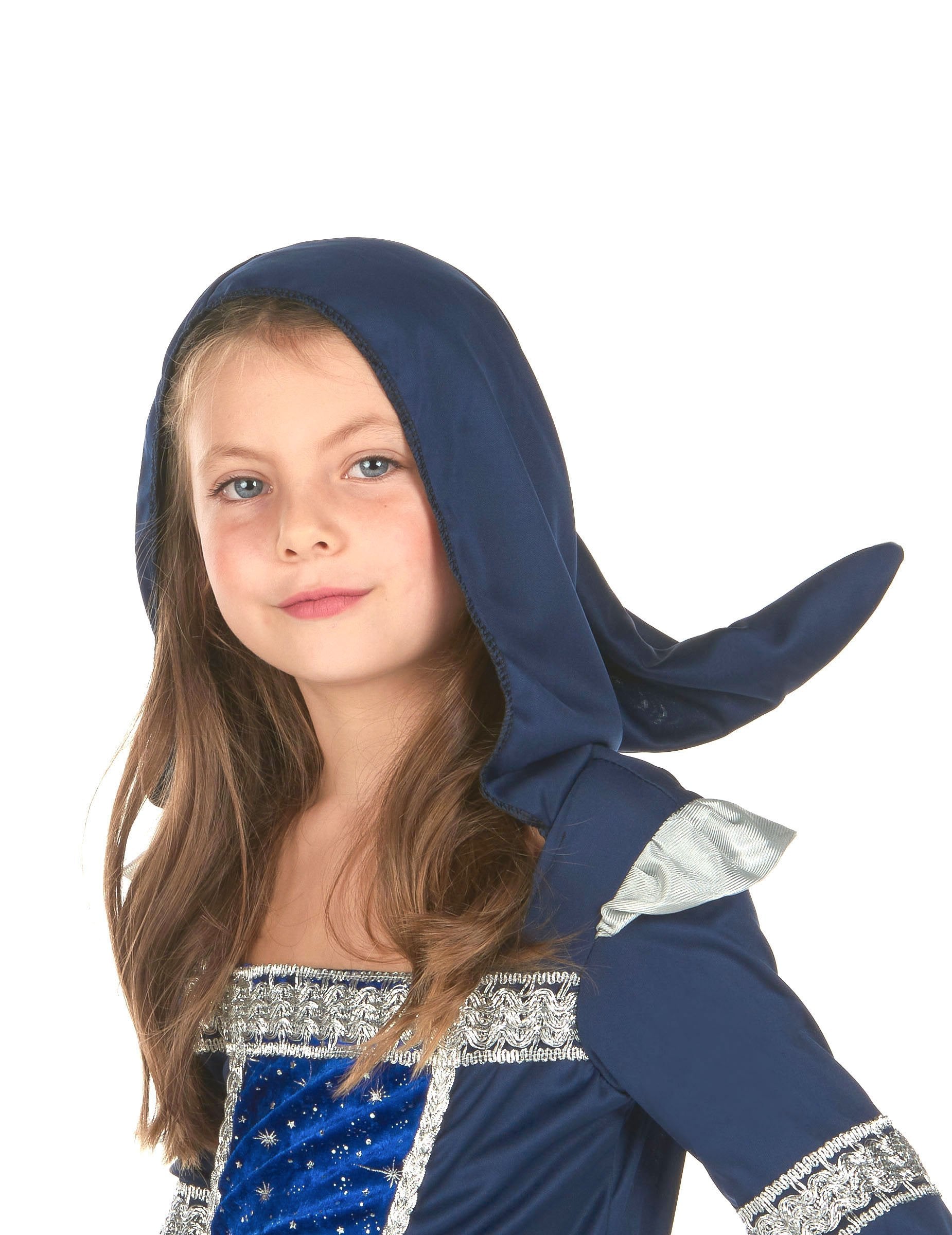 Този полунощен костюм на синия магьосник е за момиче и се състои от рокля. Роклята е с качулка и синя. Горната част е дълга -потапяща и има сребърни епалети. Той е украсен с отпечатък от различни звезди отпред. Яката и ръкавите имат сребърни модели. Дъното на роклята е среднощно синьо и е декорирано със сребърни шарки отпред. Великолепна фалшива камък украсява кръста. Забавлявайте се да хвърляте магии в Хелоуин вечер с този полунощен костюм на синия магьосник!