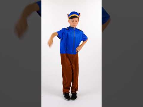 Този детски костюм на син полицейски куче е предназначен за деца. Комплектът включва гащеризон и шапка.